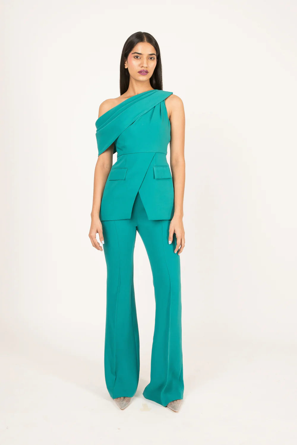 One-shoulder top with draped cowl details paired with sharply tailored flared pants. Fabric: Heavy Crepe...