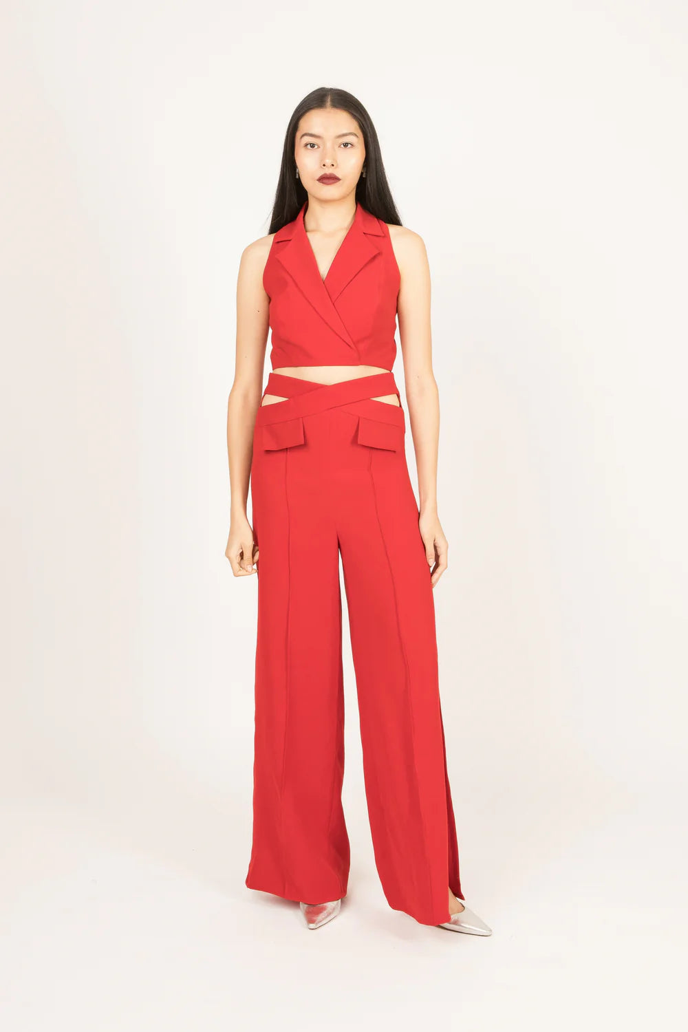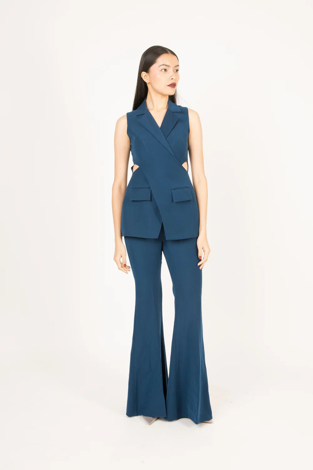 A sharply tailored, sleeveless blazer top with side cut-outs and statement pocket accents, paired with...