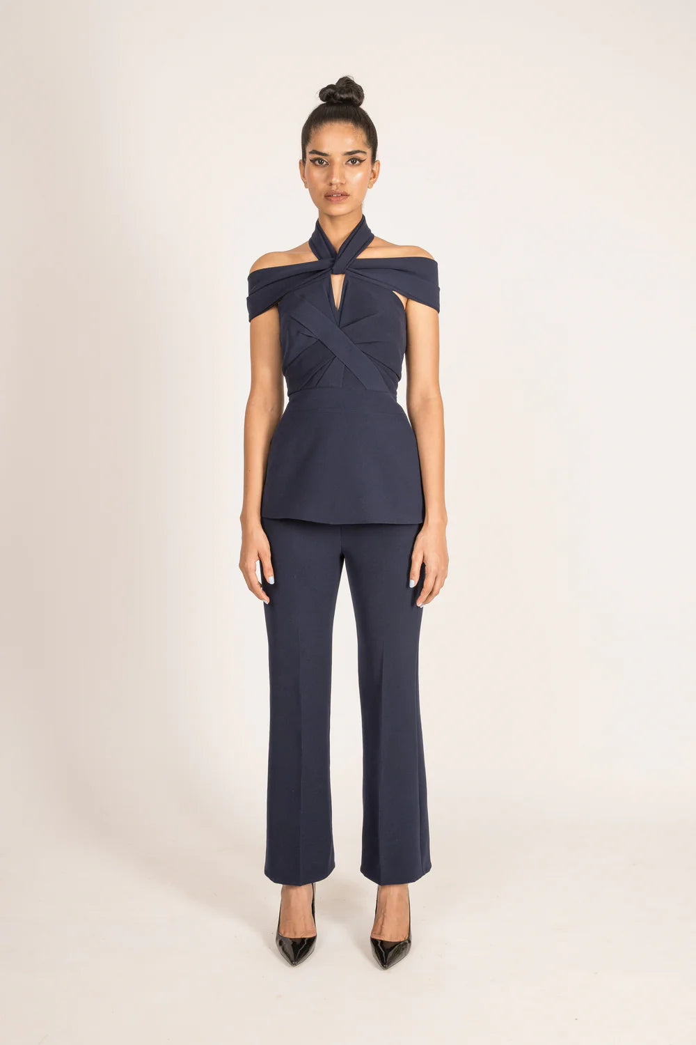 Off-shoulder pantsuit with twist neckline, keyhole cutout, and crisscross panel bodice. Paired with high-waisted flared...