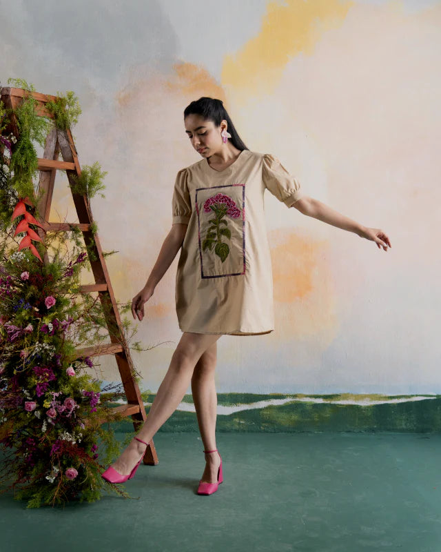 A breezy ode to nature. Crafted in soft beige with puff sleeves and bold carnation embroidery,...