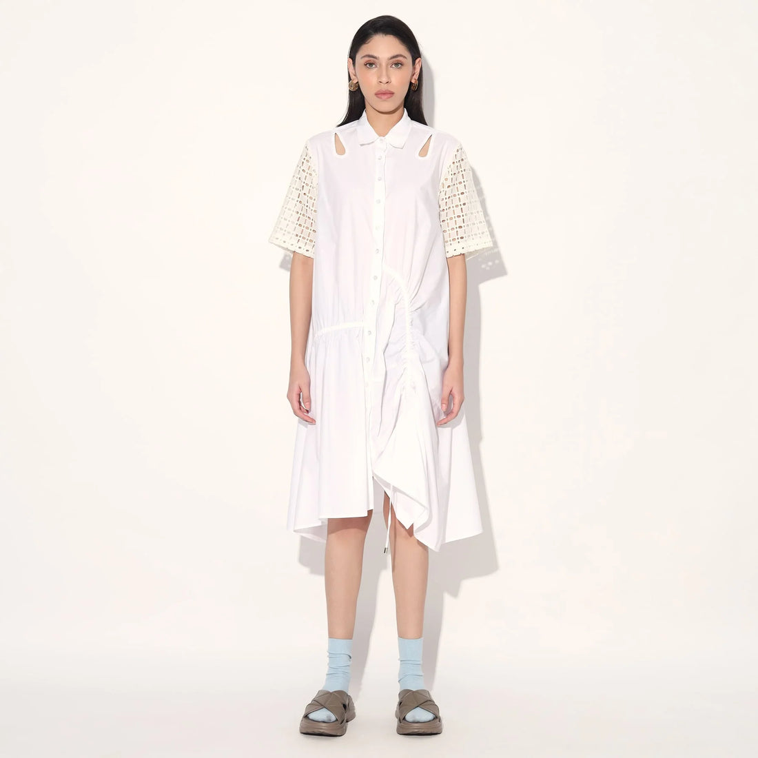 An overlapped jacket dress with a subtle side cut-away detail, combined with a gentle, hand-done...