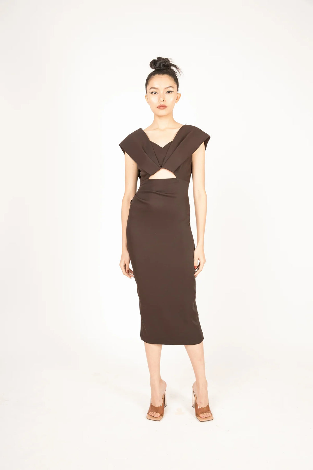 A midi dress designed with sculpted draped panel shoulders. The wide neckline frames the collarbone...