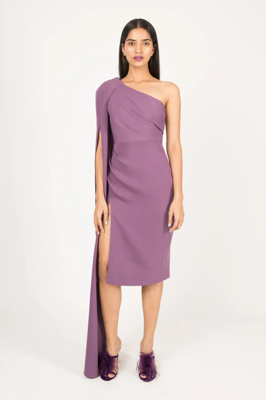 One-shoulder draped midi dress with a built-in cape sleeve and soft gathered detailing at the...