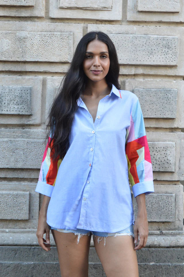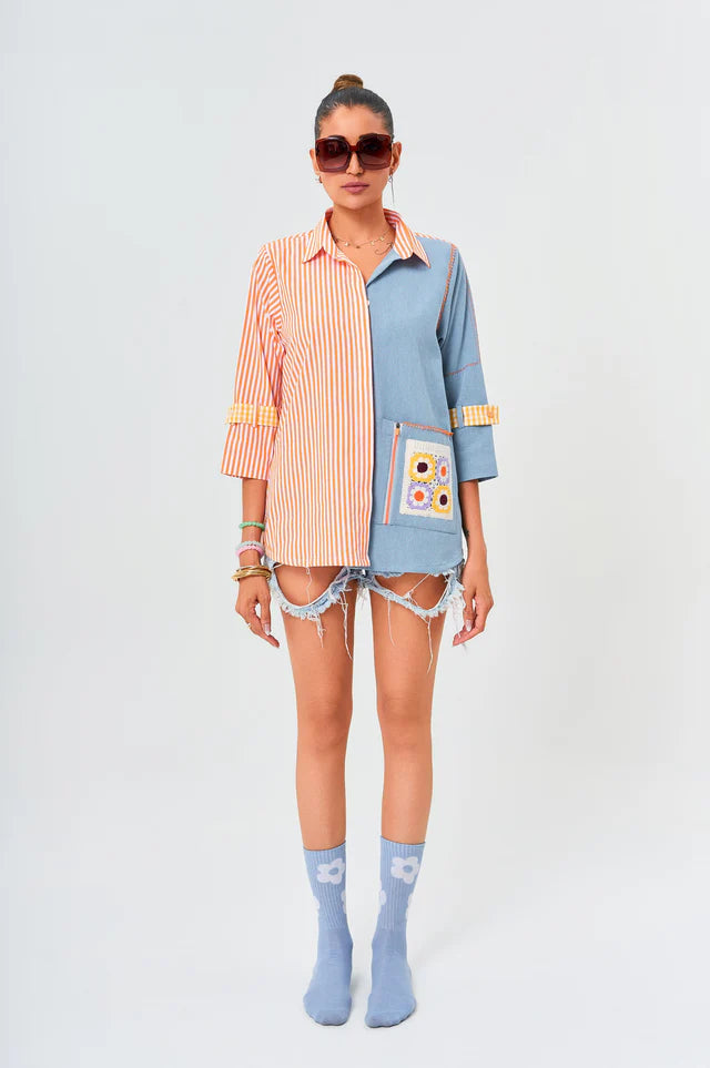 An easy wearing silhouette in cotton, this shirt features striped body with colorful patchwork sleeves....