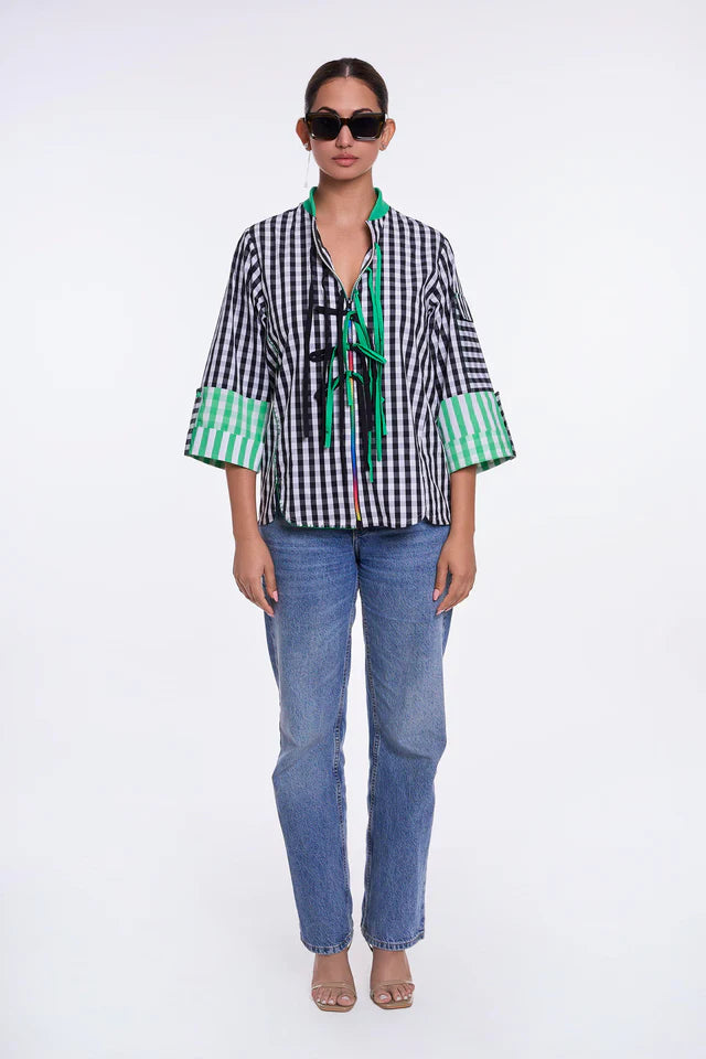 "Chessy" is a lively gingham shirt that blends bold black and white checks with fresh...
