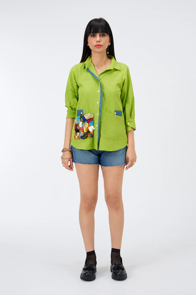 "Chatterbox" is a lime green cotton shirt that speaks volumes with its playful detailing. Featuring...