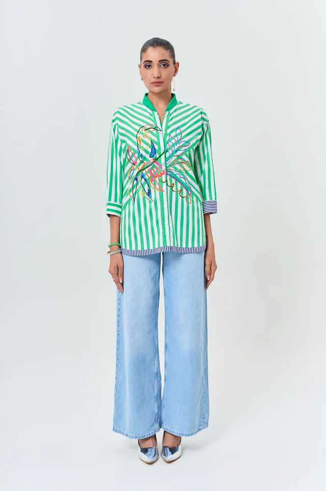 "Matcha" is where tropical energy meets effortless charm. This green and white striped cotton shirt...