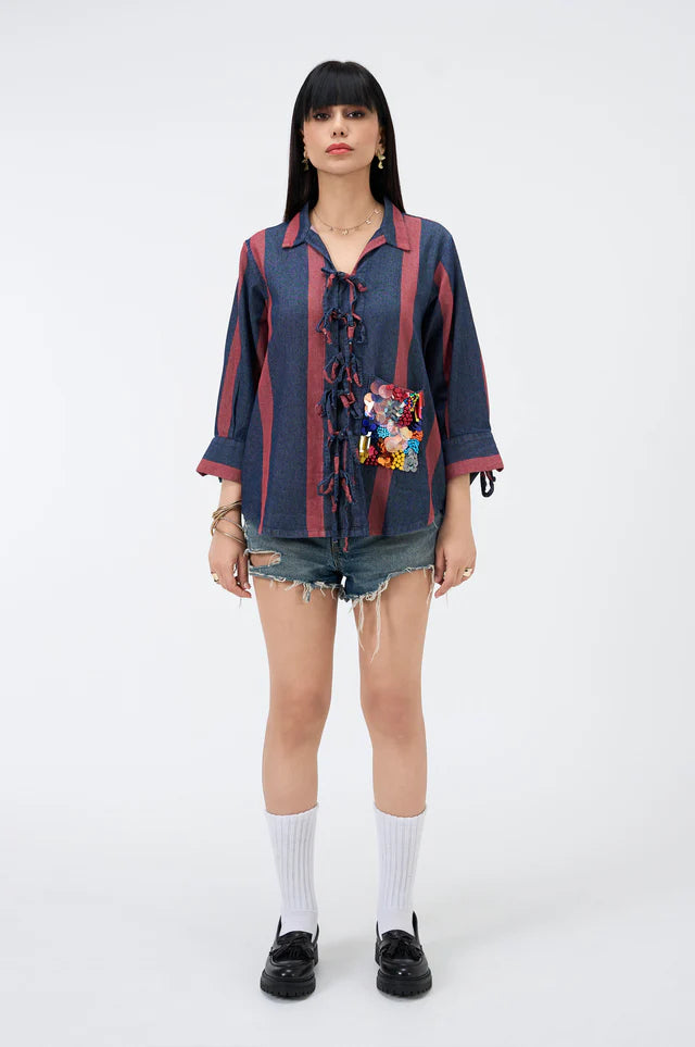 Bold red-and-indigo stripes meet attitude in "Pocket Rocket" — a front tie-up denim shirt with...