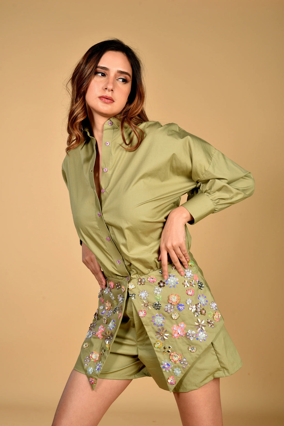 A crisp button-down shirt, the Lara shirt is adorned with delicate rhinestones and sequins embellishments...