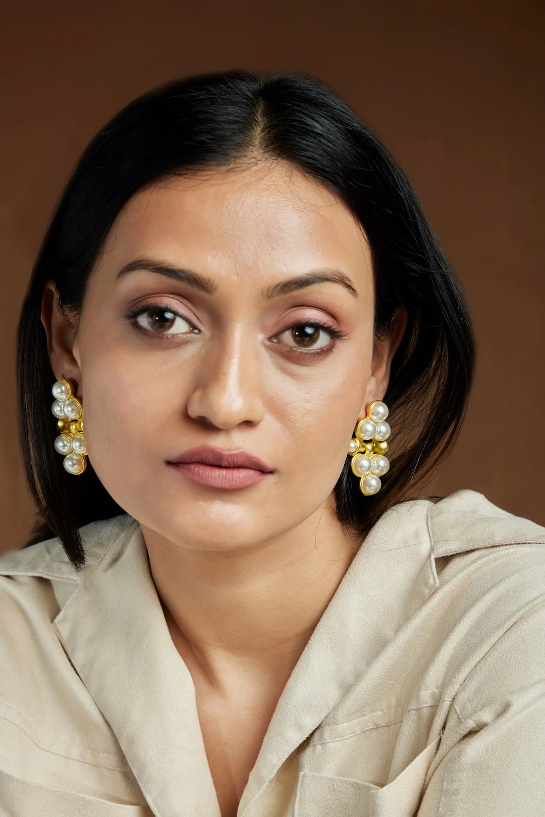 Earrings features a uniquely placed pearl stud earrings with vintage gold polish. These classic studs...
