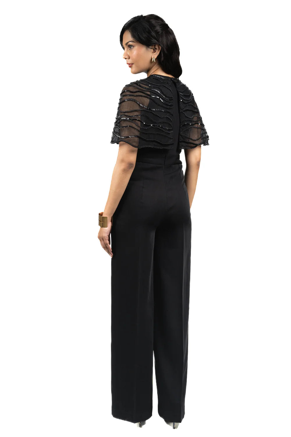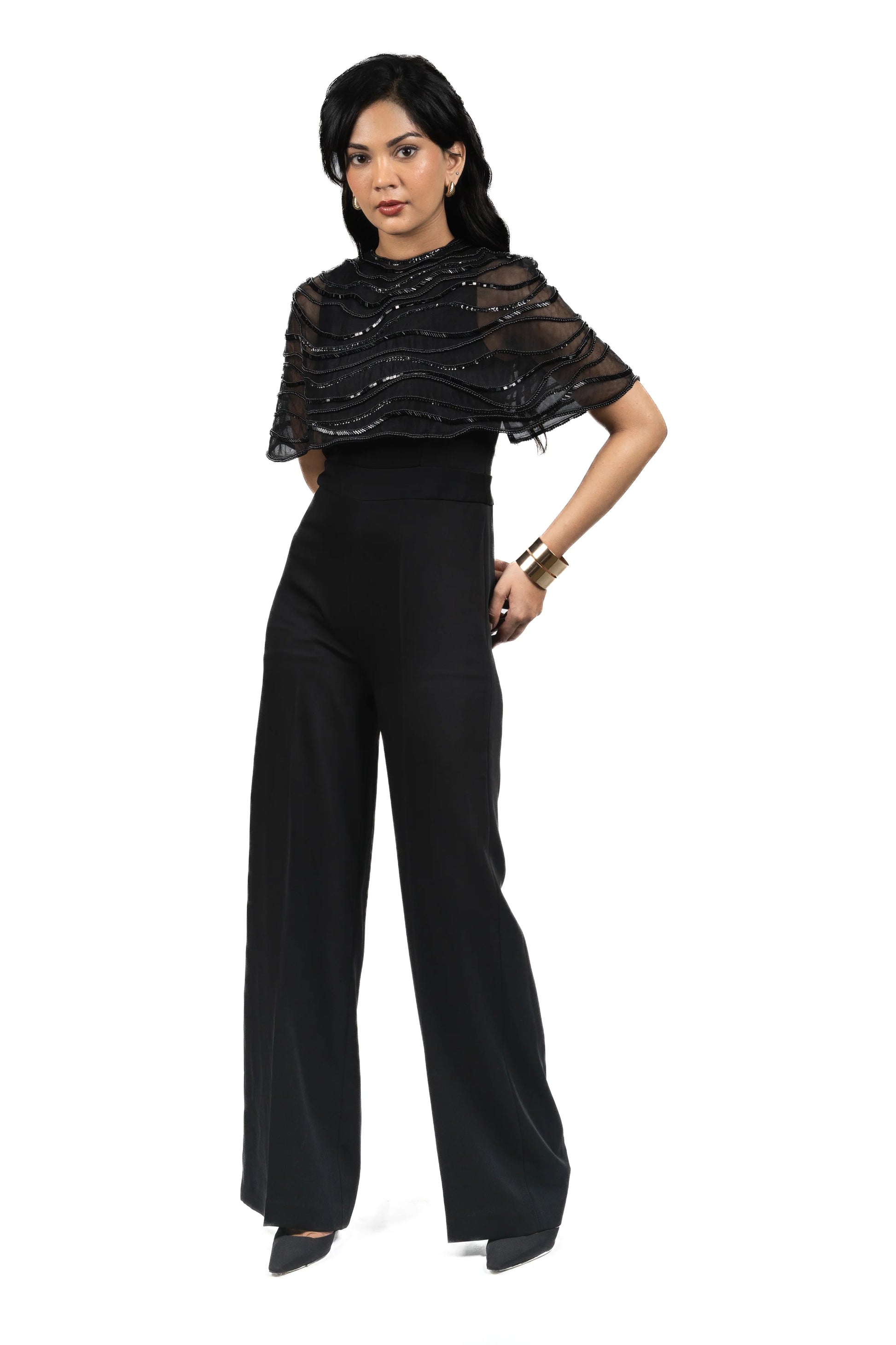 Sleeveless jumpsuit paired with a sheer beaded cape, where beadwork flows in soft waves to create texture.