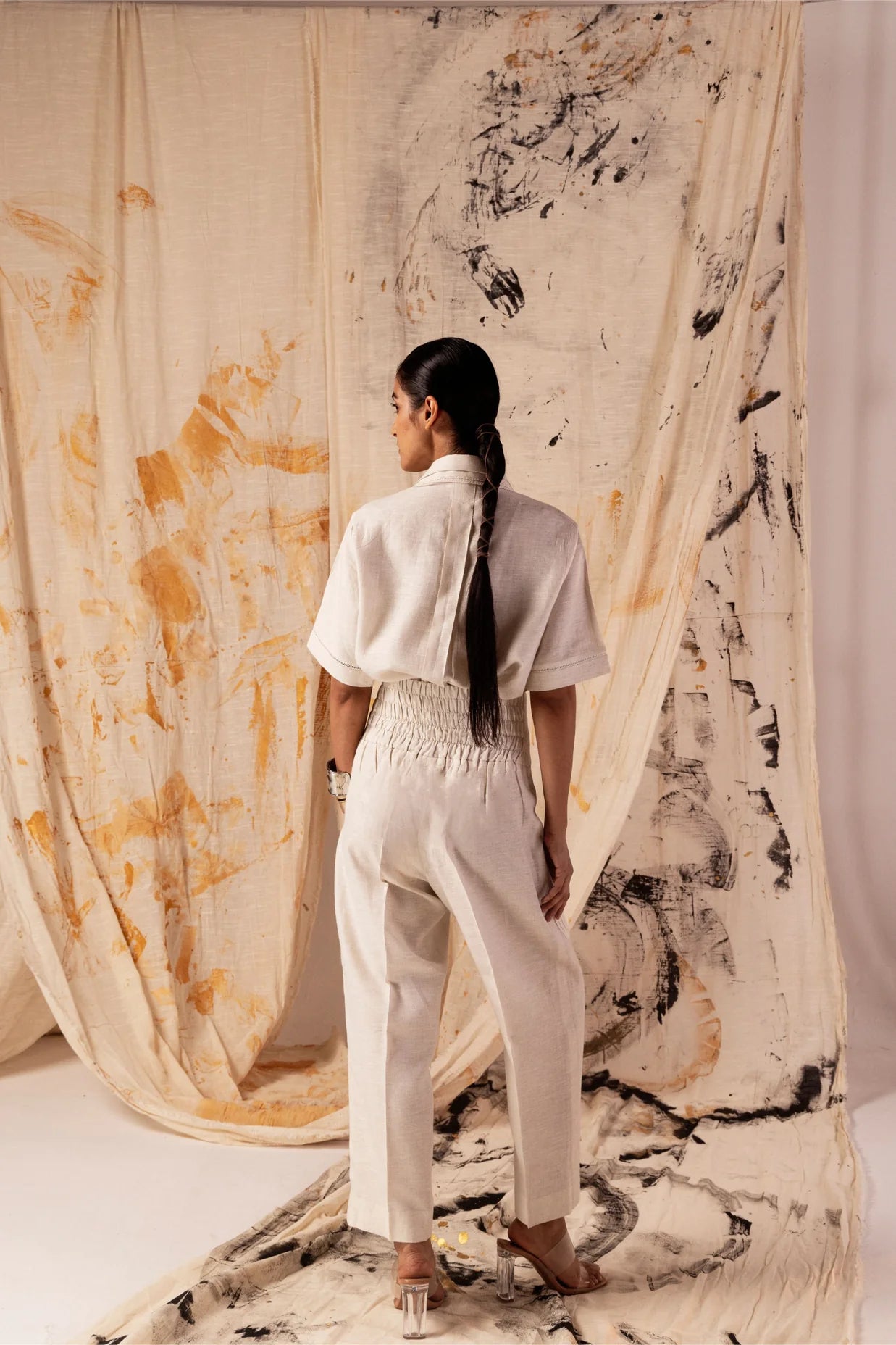 Almondine Beige linen shirt with a double collar and lace trim on the placket, which is made from white linen. The shirt has half sleeves with lace details. The matching beige linen pants have a wide waistband, elasticated at the back, and large front pockets in white linen with lace detailing. The pants have a straight fit.