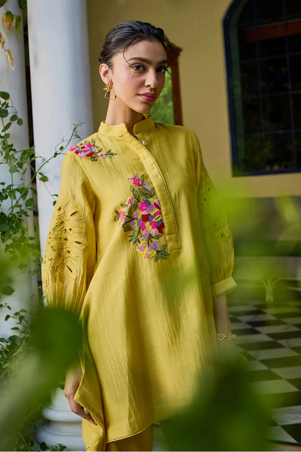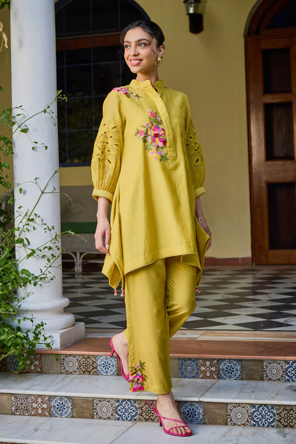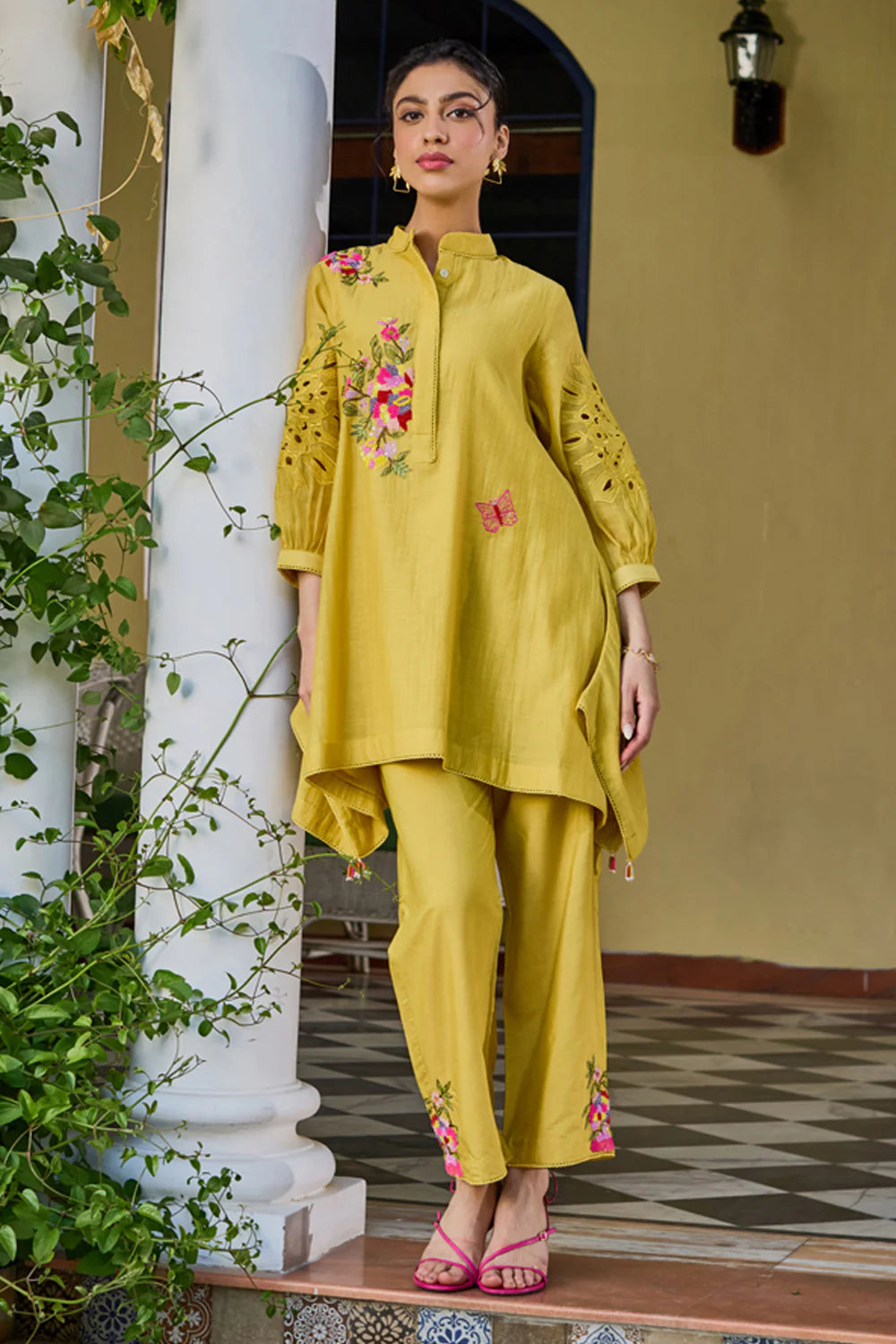 Hand-embroidered motifs adorning the front and cutwork details on the sleeves. Paired with straight-cut pants embellished with hand-embroidered motifs along the sides, this ensemble strikes the perfect balance between modern pizzazz and ethnic allure.