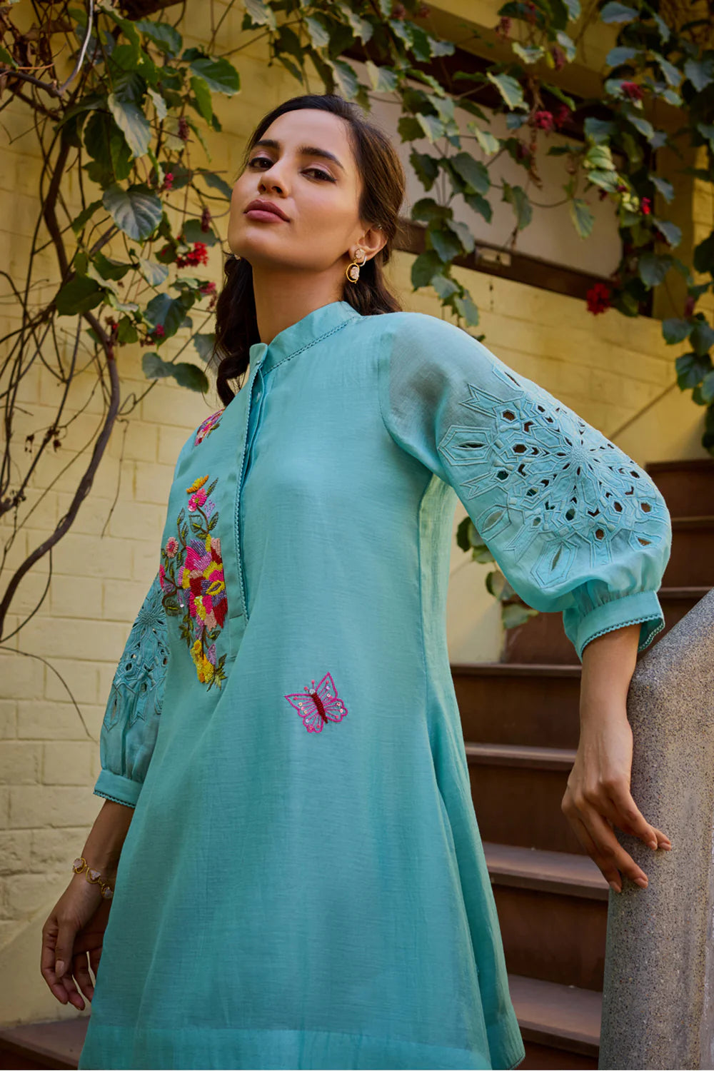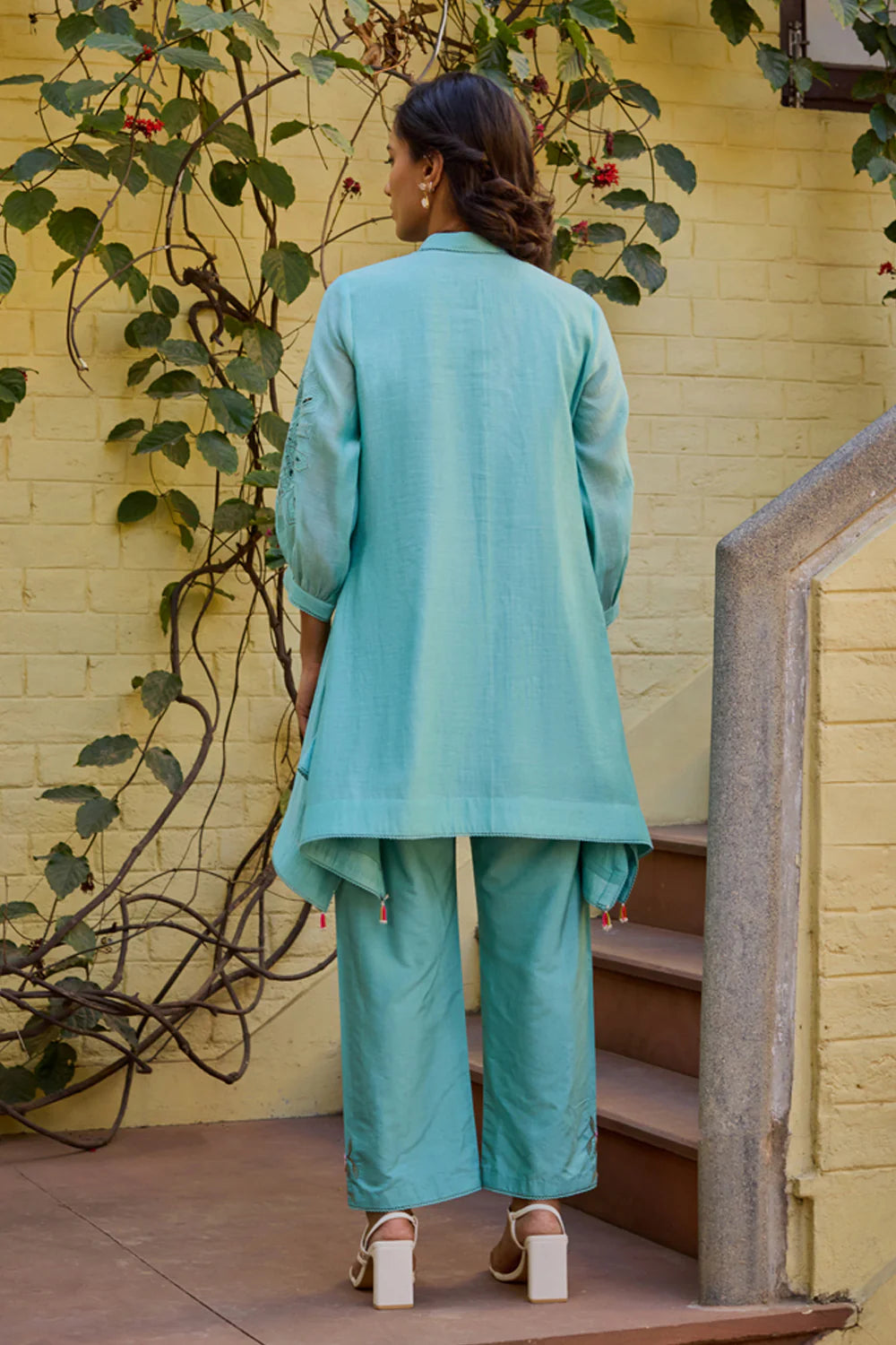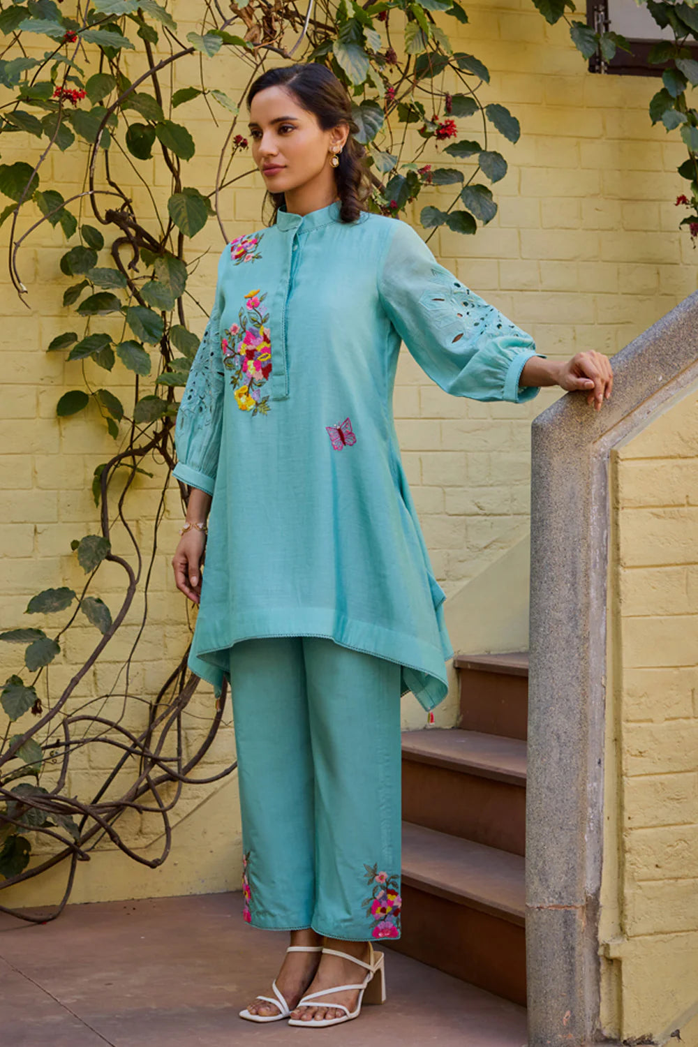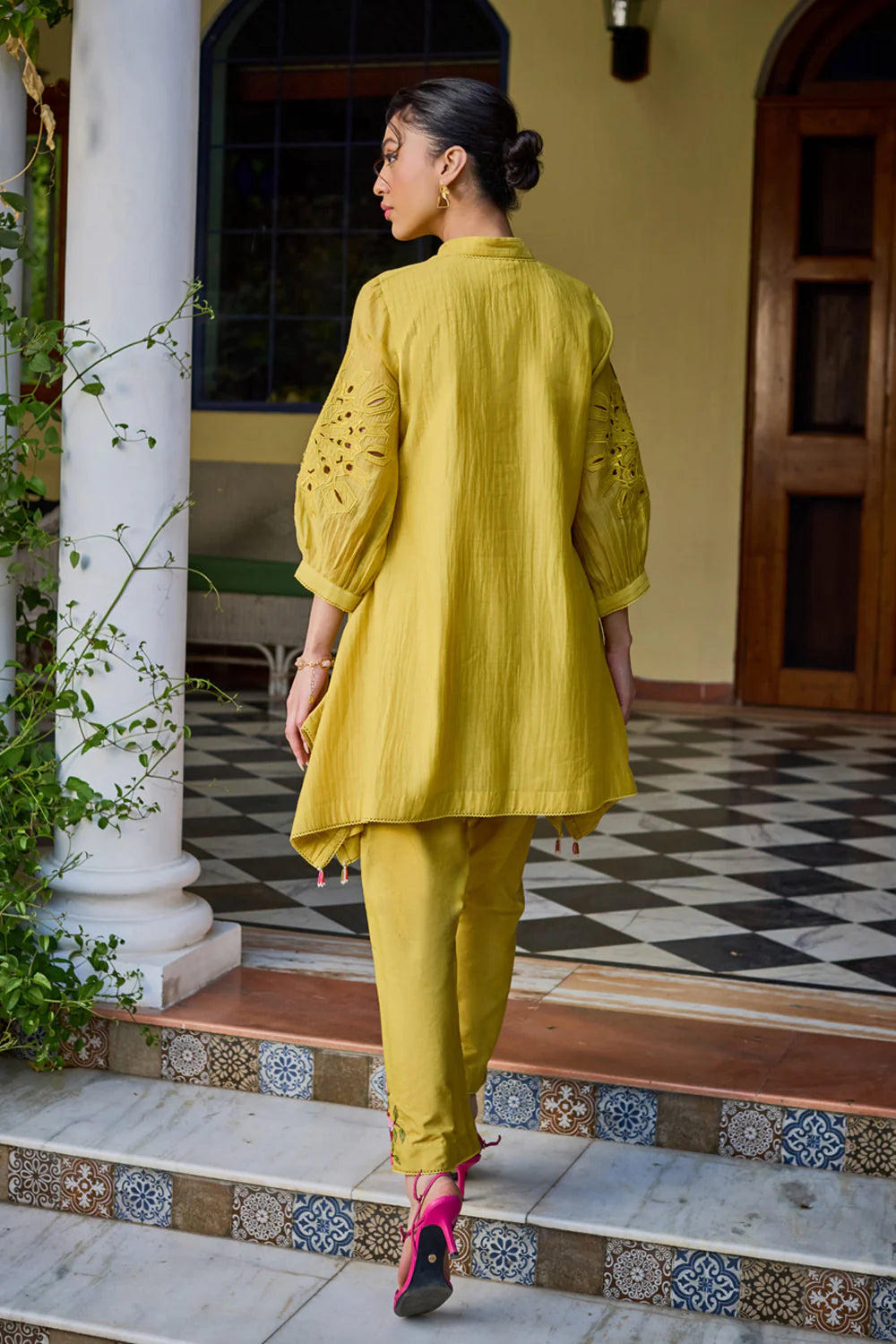 Hand-embroidered motifs adorning the front and cutwork details on the sleeves. Paired with straight-cut pants embellished with hand-embroidered motifs along the sides, this ensemble strikes the perfect balance between modern pizzazz and ethnic allure.