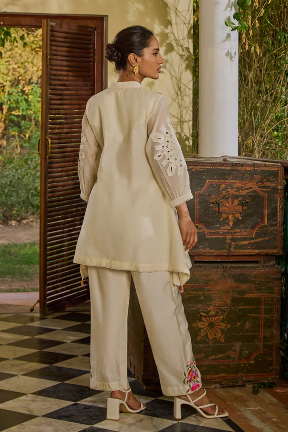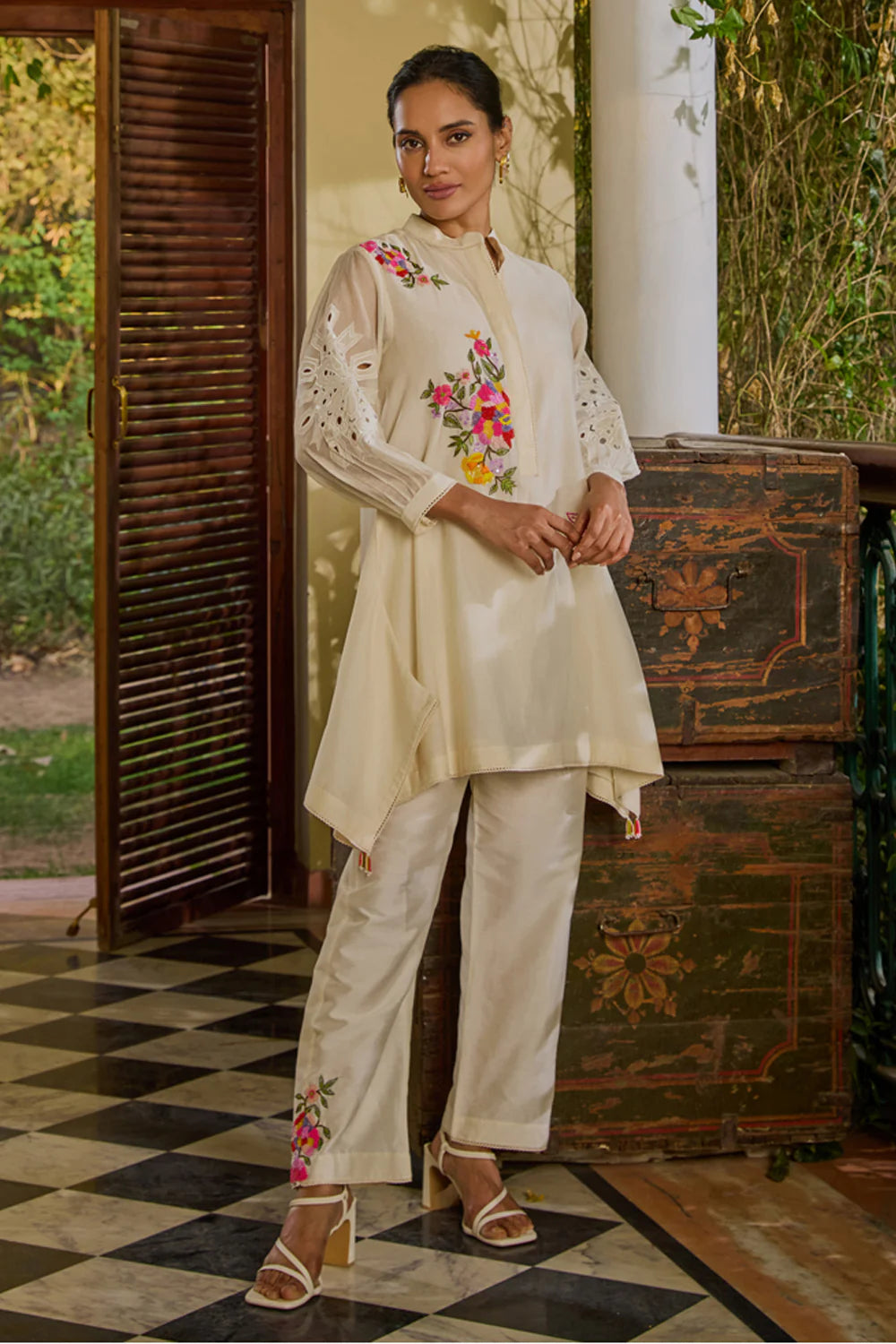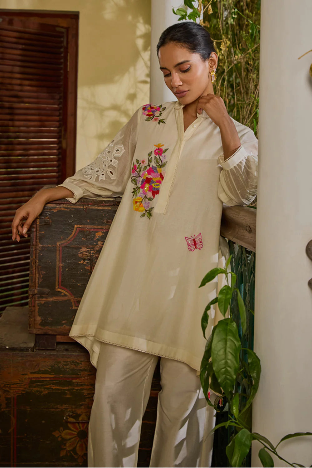 Hand-embroidered motifs adorning the front and cutwork details on the sleeves. Paired with straight-cut pants embellished with hand-embroidered motifs along the sides, this ensemble strikes the perfect balance between modern pizzazz and ethnic allure.