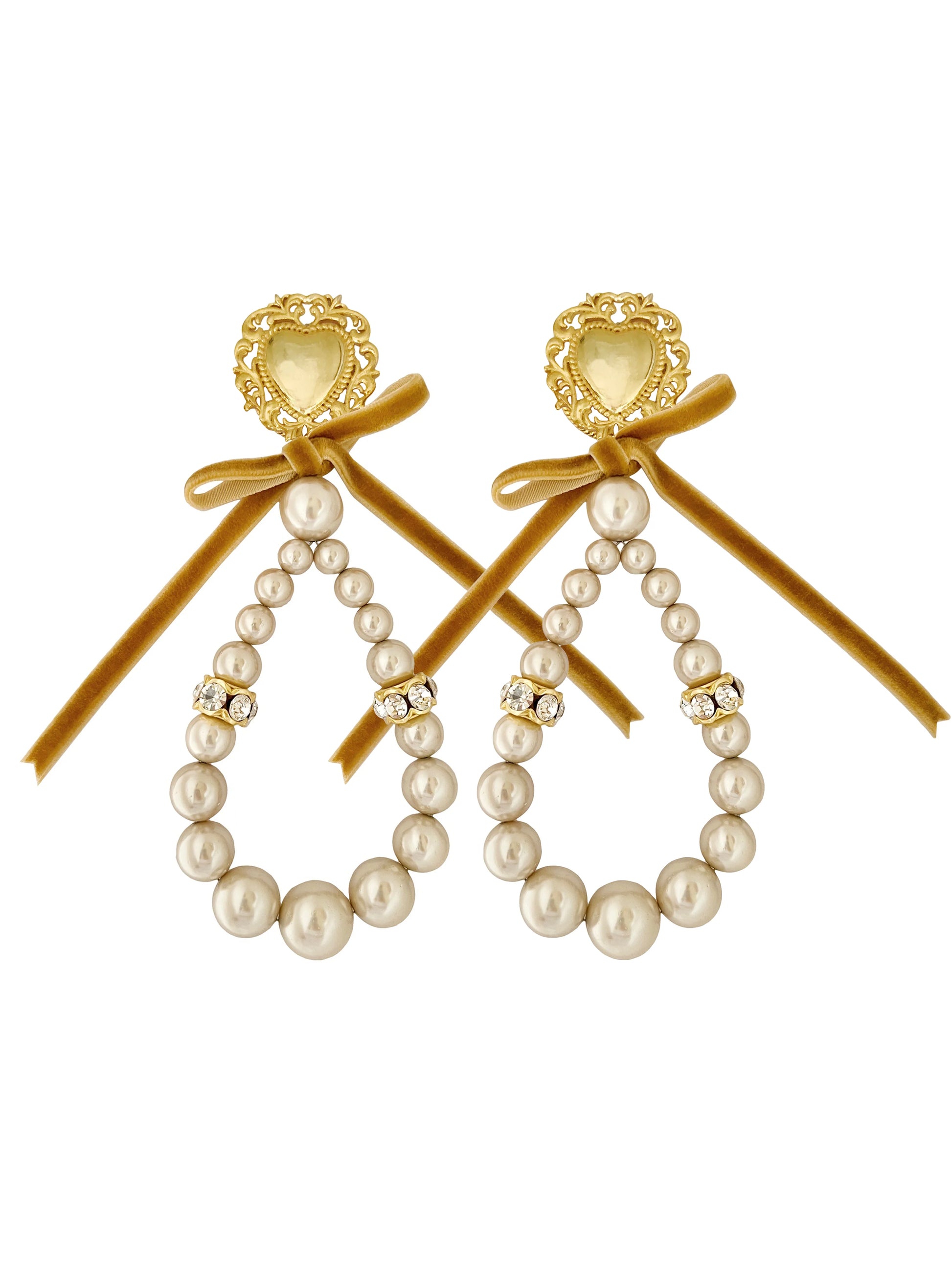 AMOUR ÉCLAT celebrates romance and charm with pearl loops, crystal accents, and a golden heart top. Finished with a velvet bow, these earrings are playful, elegant, and perfect for statement styling.