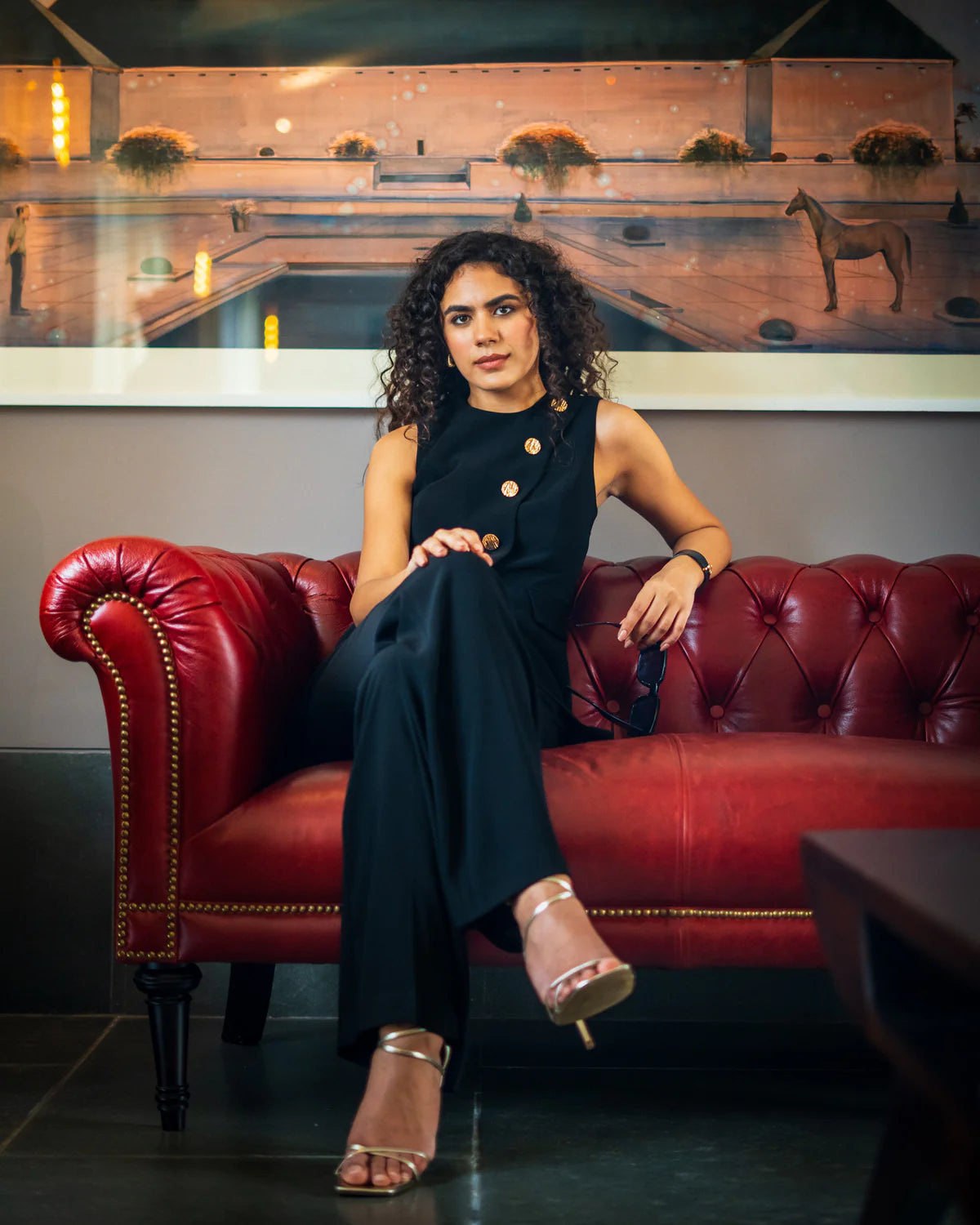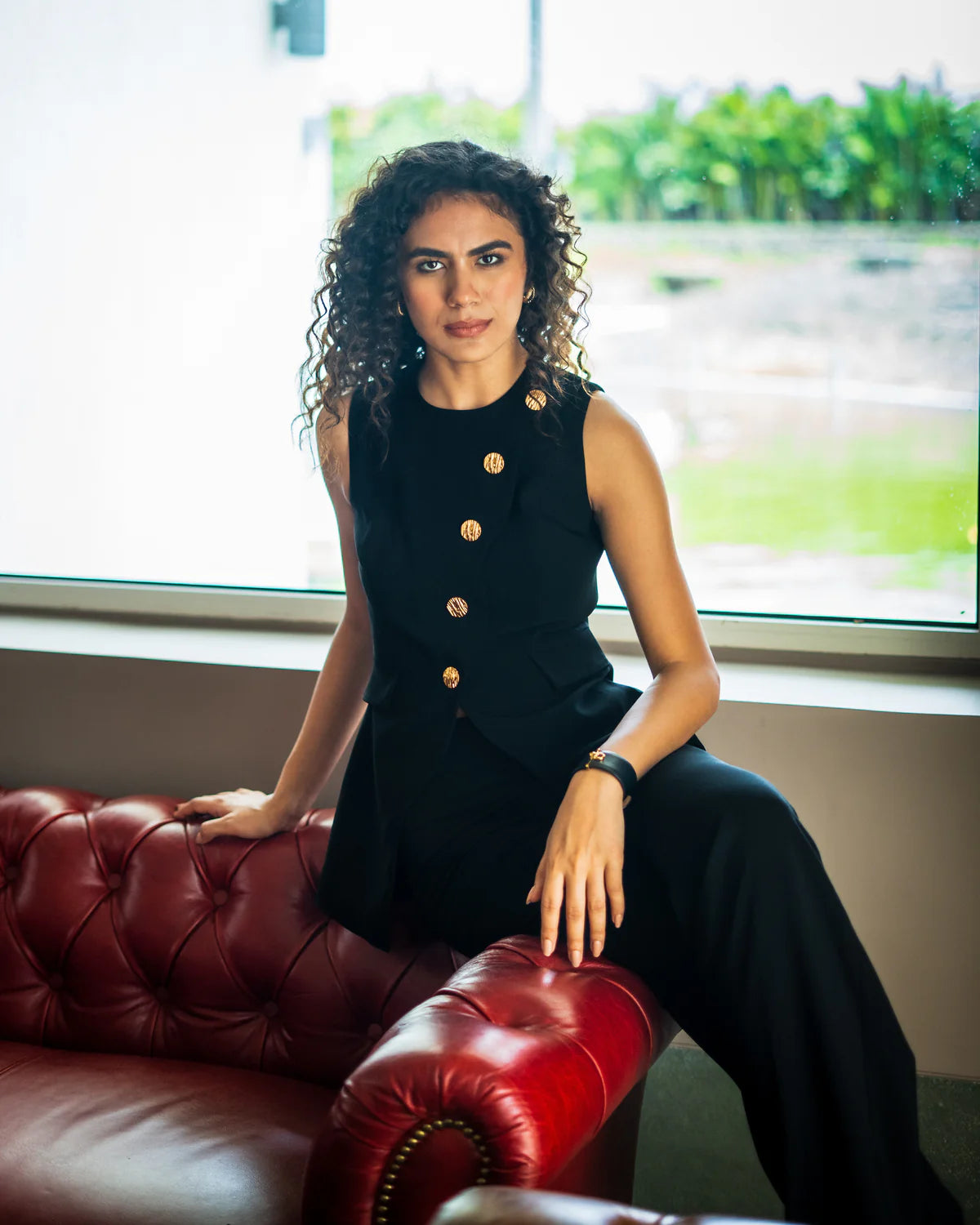 Sleeveless blazer with a curved front placket, detailed with asymmetrically placed metallic buttons. Paired with bell-bottom trousers.