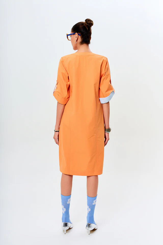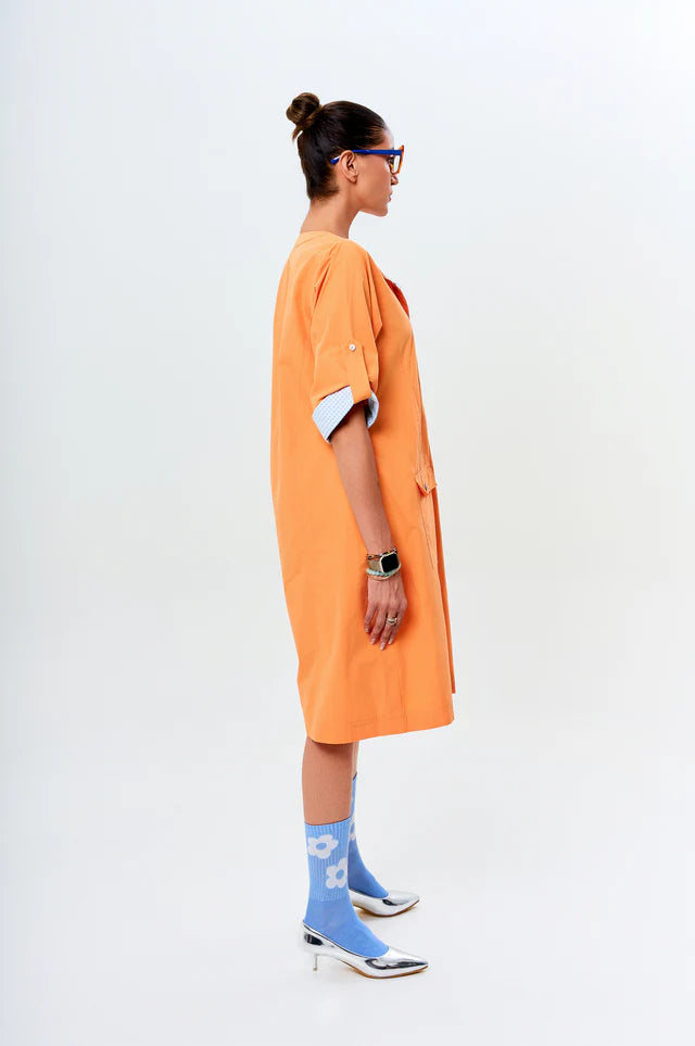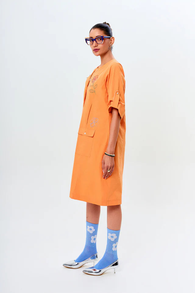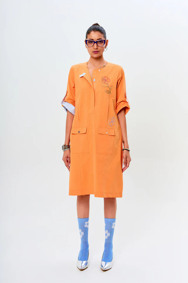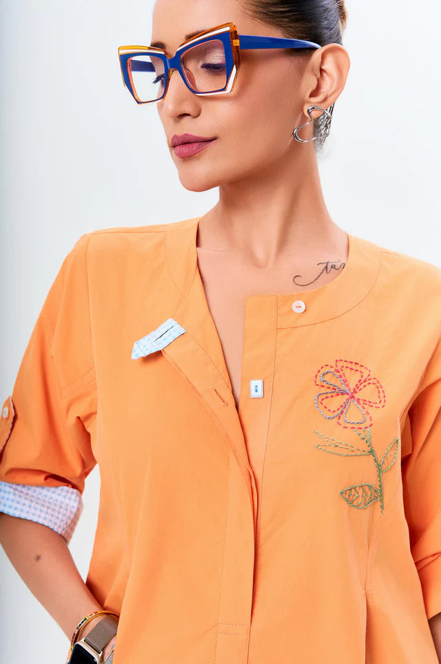 Ava brings a fresh, playful spirit with its peach hue and vibrant blue accents. The relaxed silhouette is elevated with abstract floral embroidery and contrast piping along the cuffs and collar. Functional patch pockets add a utilitarian charm, while the buttoned sleeves offer versatility. A breezy yet polished pick for days when ease meets style.