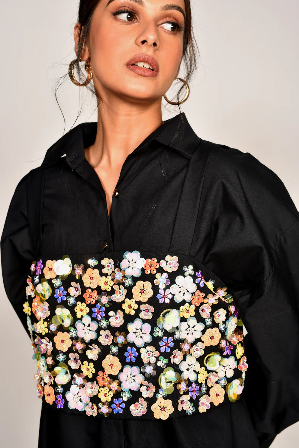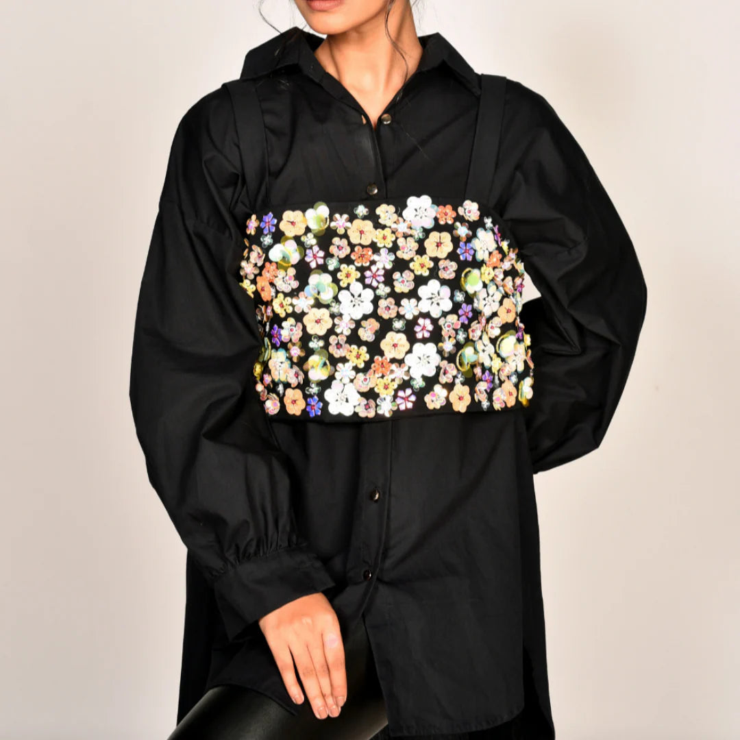 A delicately scattered floral sequinned bustier that could be wprn over a shirt, dress or even by itself. It’s well fitted and oh! so chic. It’s sure to make heads turn and definitely a conversation starter.