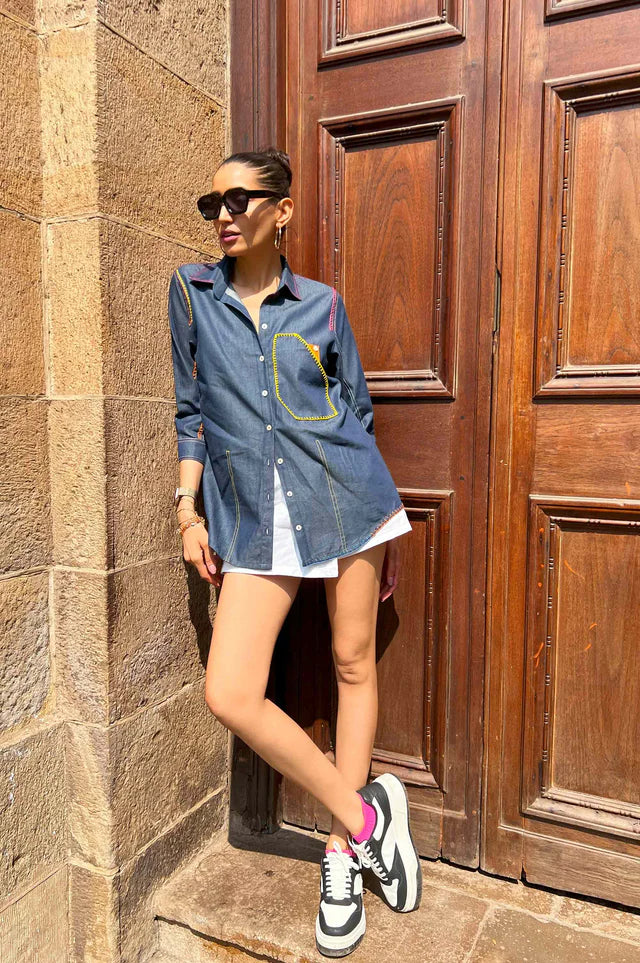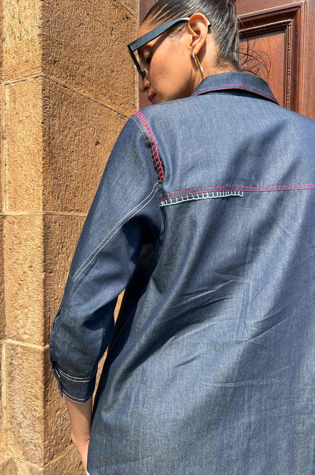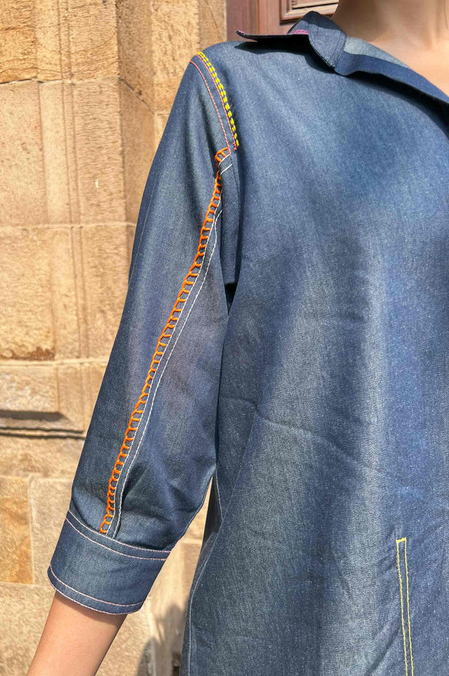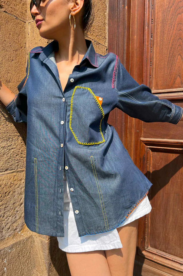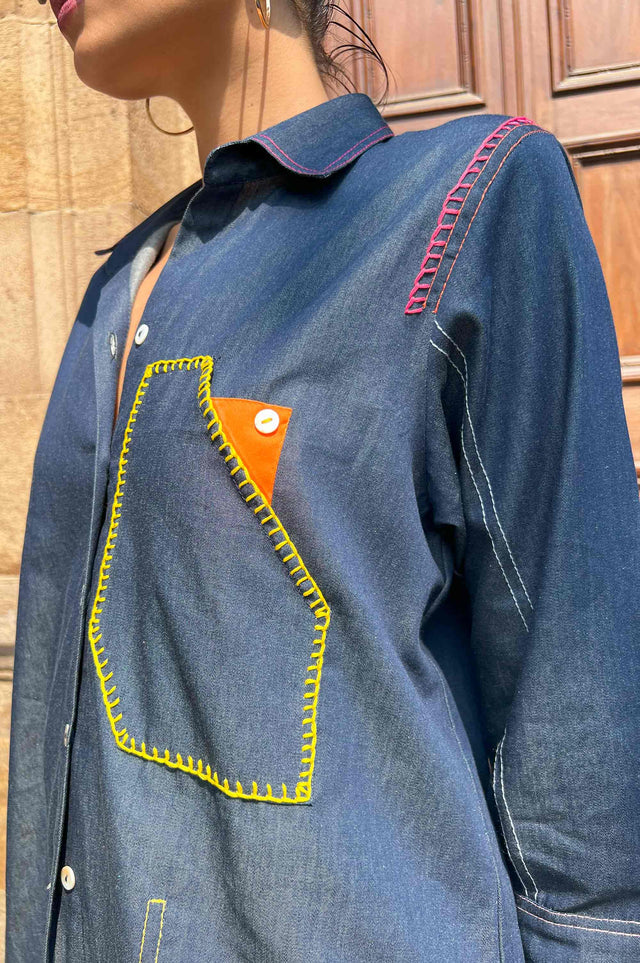 Blue Hour – where denim dreams come to life! This denim shirt boasts stitch lines and buttonhole hand embroidery, plus an oversized pocket for that extra touch of style. Mix and match with our loose pants, or let your creativity run wild and create your own fashion magic.