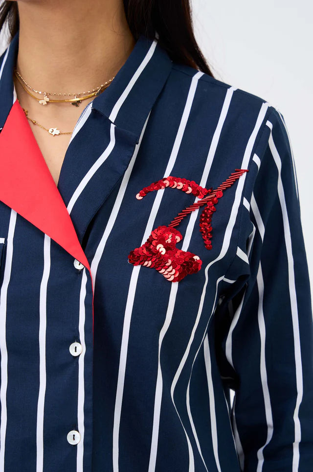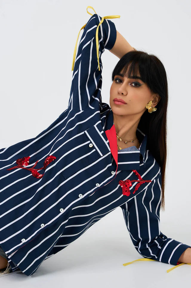 Buzz makes an electric statement with its navy-and-white stripes and abstract floral sequin embroidery in bold red. The pop of coral at the collar and bright yellow tie-ups at the sleeves bring a jolt of energy, while the soft cotton base keeps it breathable. A shirt that lives loud — just like you.
