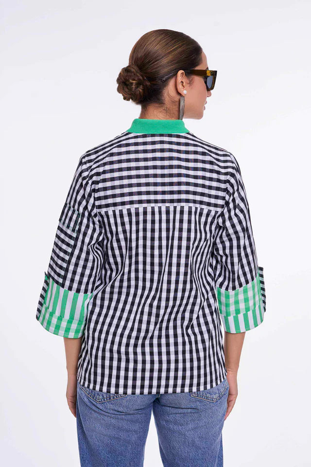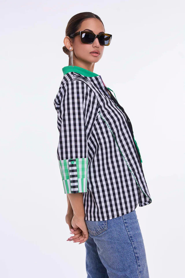 "Chessy" is a lively gingham shirt that blends bold black and white checks with fresh green accents. Featuring playful tie details and striped cuffs, it’s designed to stand out. A perfect mix of comfort and charm for your casual outings or a stylish brunch date.