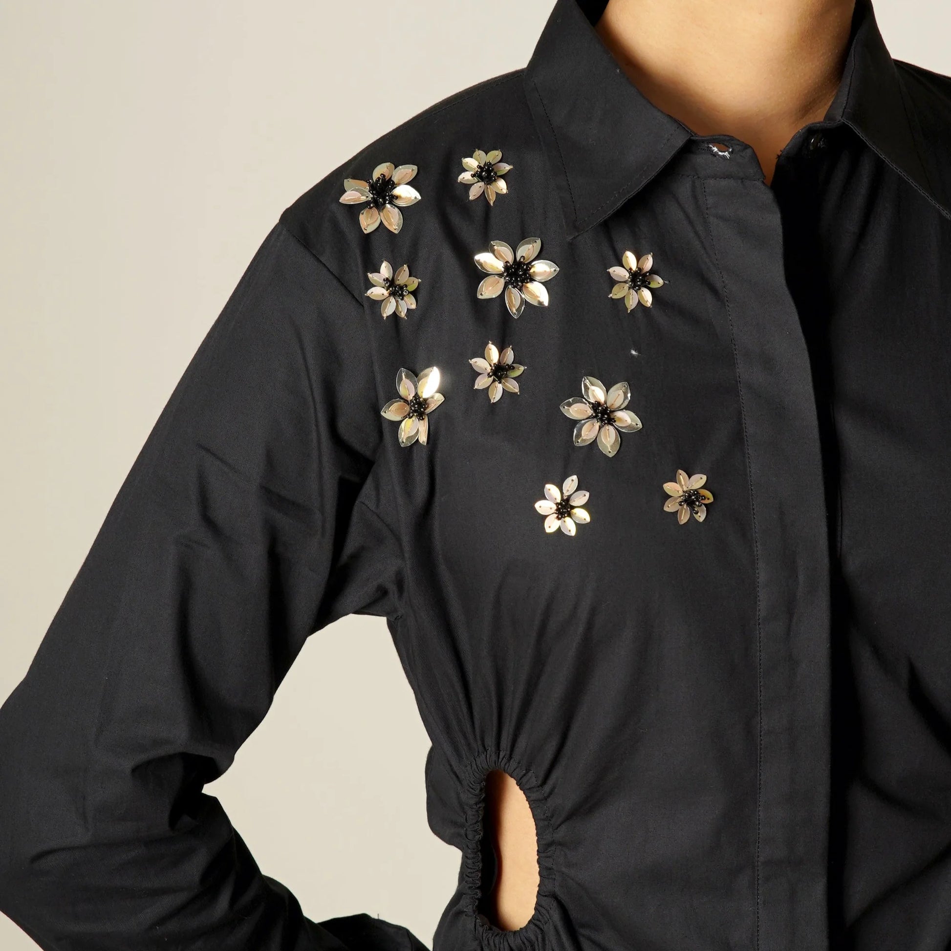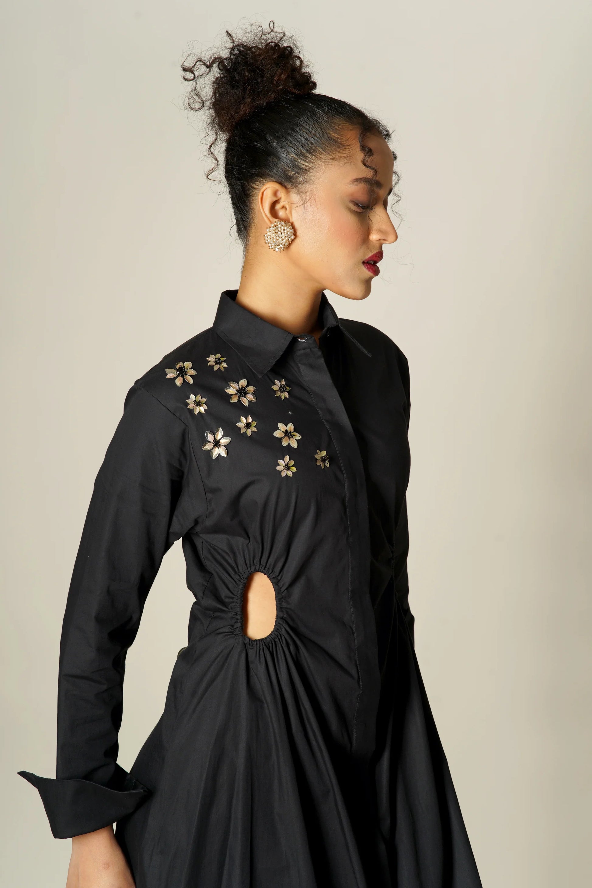 Unleash effortless elegance with our Cierra Cut Out Dress, a perfect blend of sophistication and contemporary flair. This dress features delicate floral embroidery on the shoulder, adding a touch of understated glamour. The cinched side cutouts create a flattering silhouette while maintaining a chic, modest design. Ideal for evening events or sophisticated daytime looks, this versatile piece pairs beautifully with statement heels or subtle accessories for a timeless, polished ensemble.