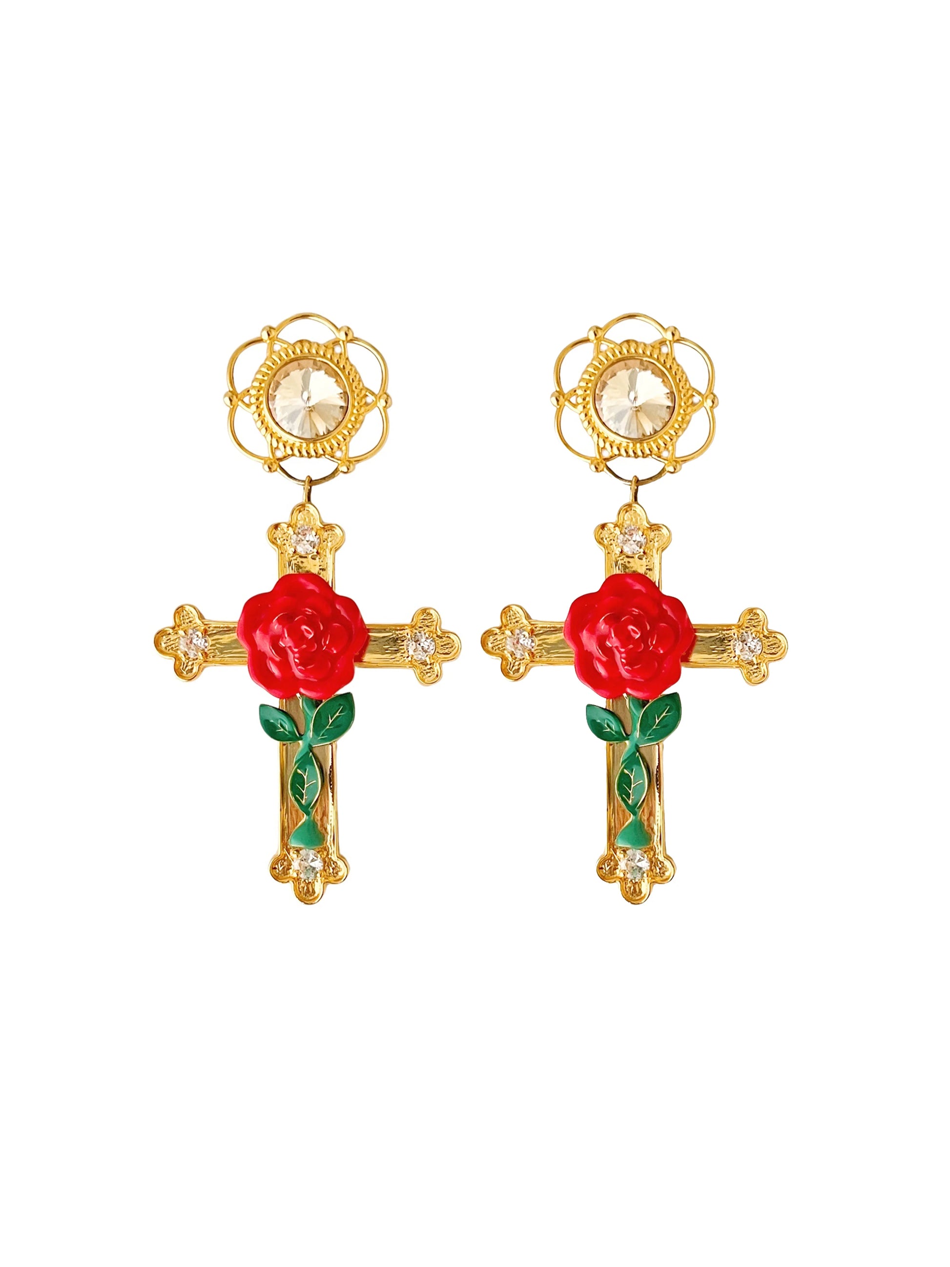 CLAIR DE ROSE captures romance and bold artistry with a golden cross, crystal accents, and a striking red rose motif. A statement piece that blends vintage charm with contemporary drama.