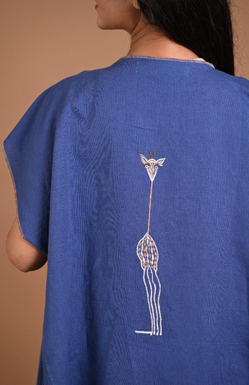 A bold cobalt blue jacket that brings an elevated touch to casual dressing. Featuring signature line giraffe embroidered in nude and white on the back, this piece adds a subtle yet sophisticated nod to the wild, perfect for layering over linen essentials.