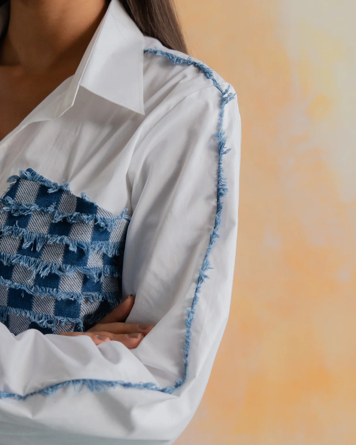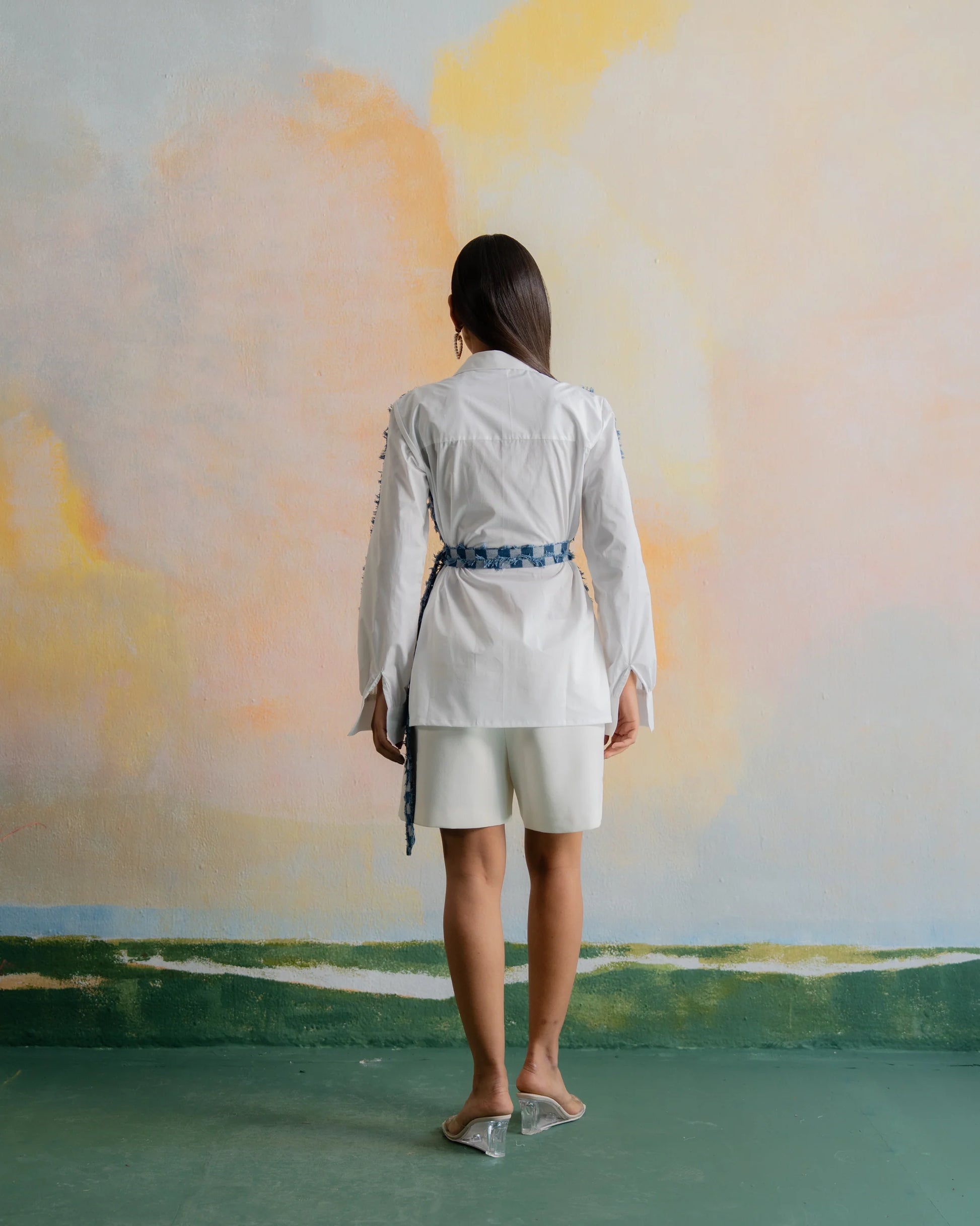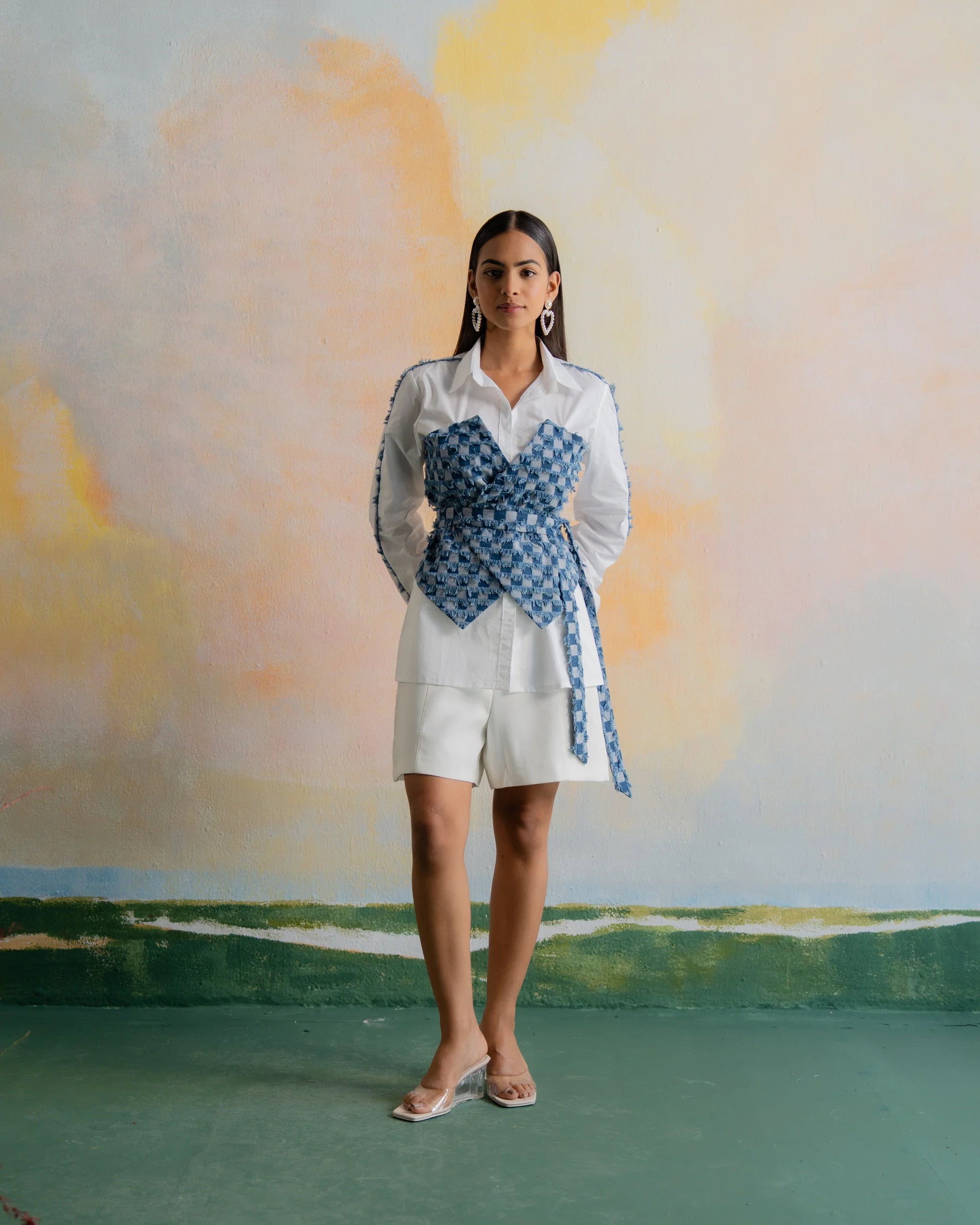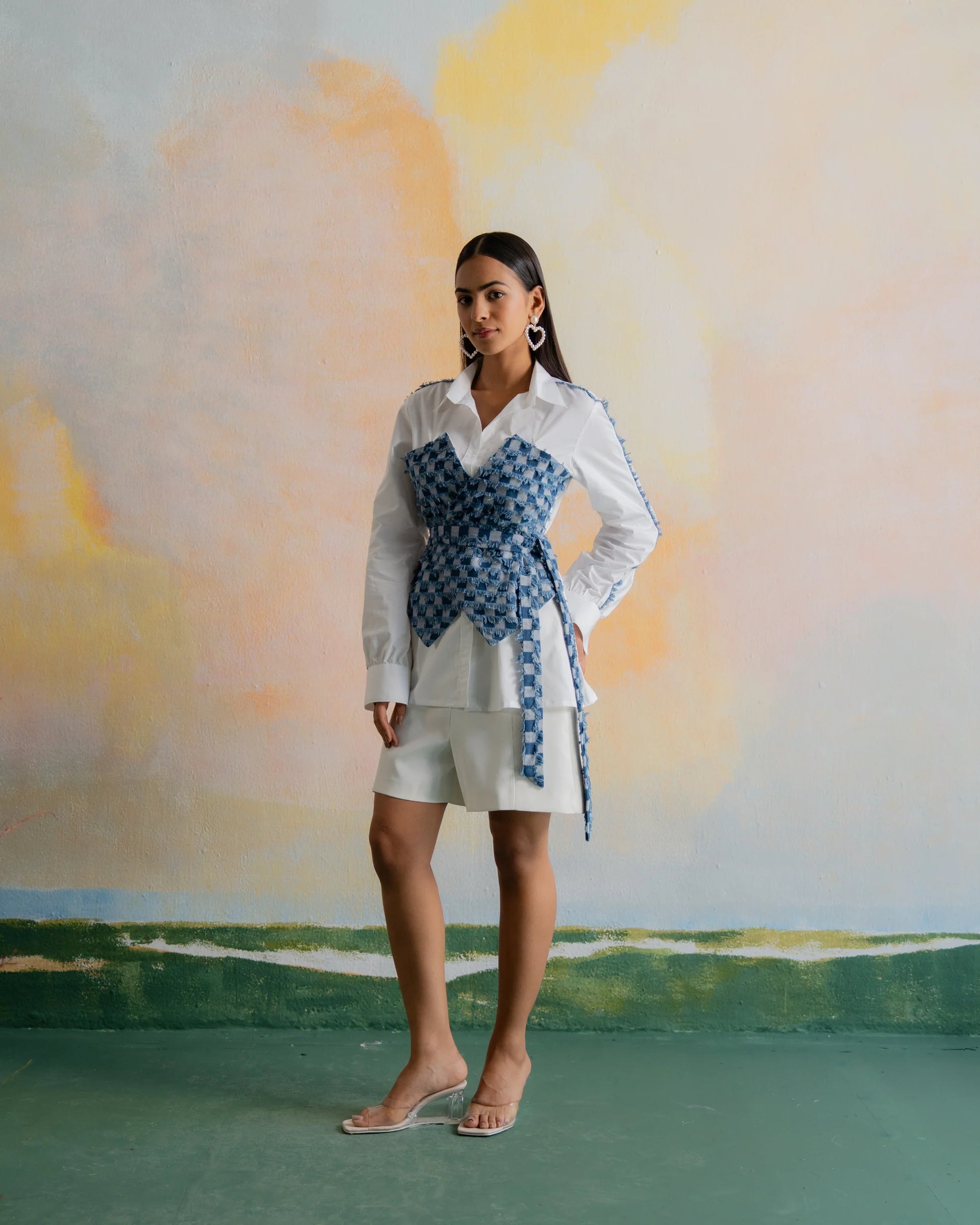 A pixelated blue-on-white dream, this corset-inspired overlay blends basic with a modern edge. Draped over a crisp shirt, it wraps and cinches with tailored precision—coding your style with quiet rebellion and contemporary flair.