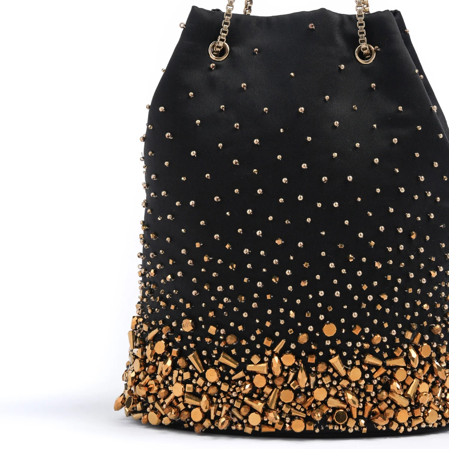 Is It a Butwa? Is it a Potli bag? No, It is a Cristallo Bag! This bag with it’s crunchy crystal and metal elements in silver on grey silk fabric is a must have.