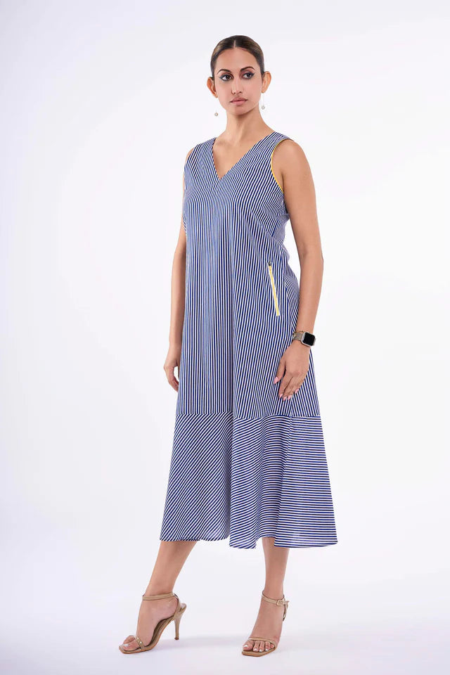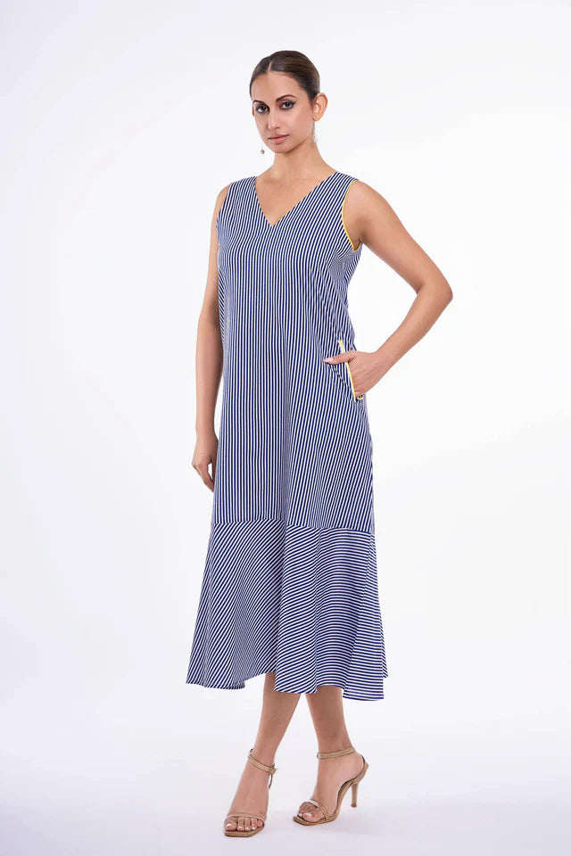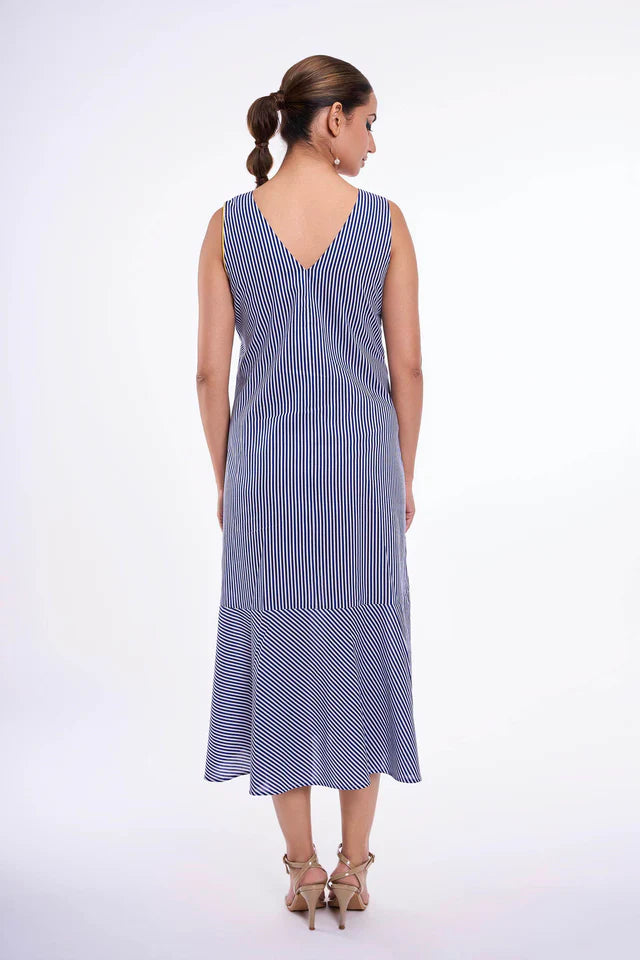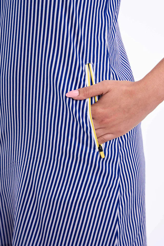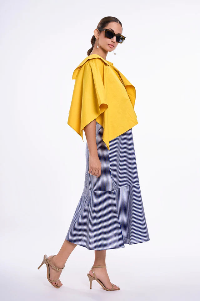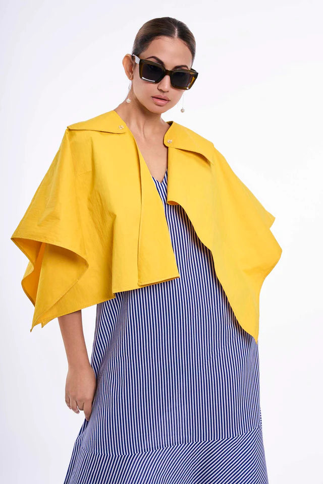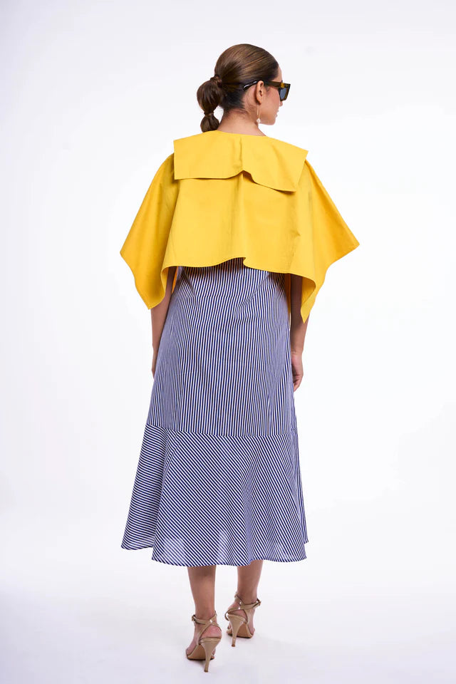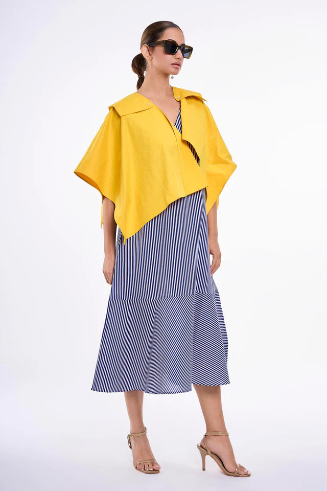 Brighten your day with 'Dandelion,' a breezy two-piece set blending a sunny yellow cape with bold navy stripes. This flowy and versatile outfit is combined with the Bluette dress, perfect for brunch dates or a stroll by the seaside. Comfort meets effortless style in every fold!