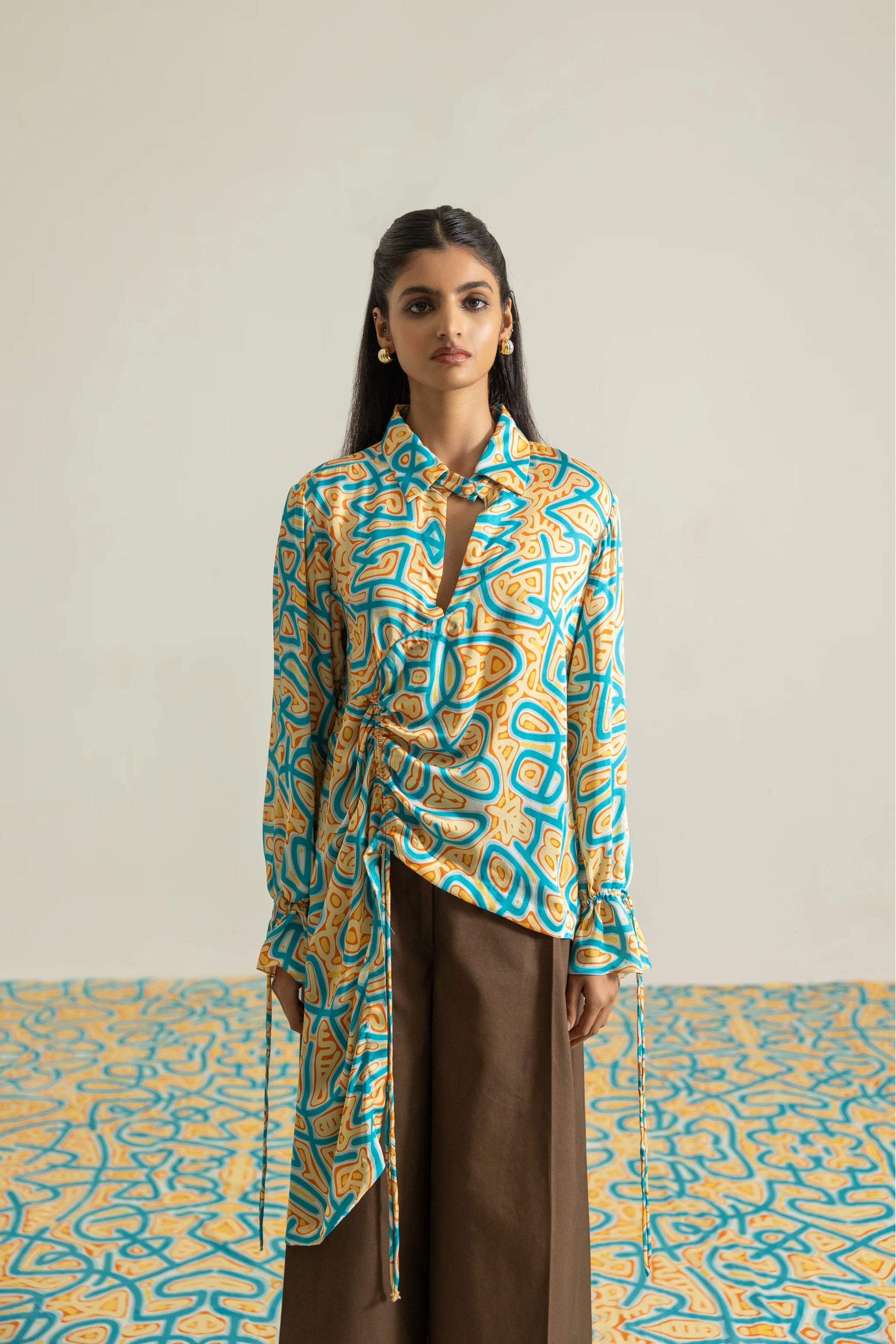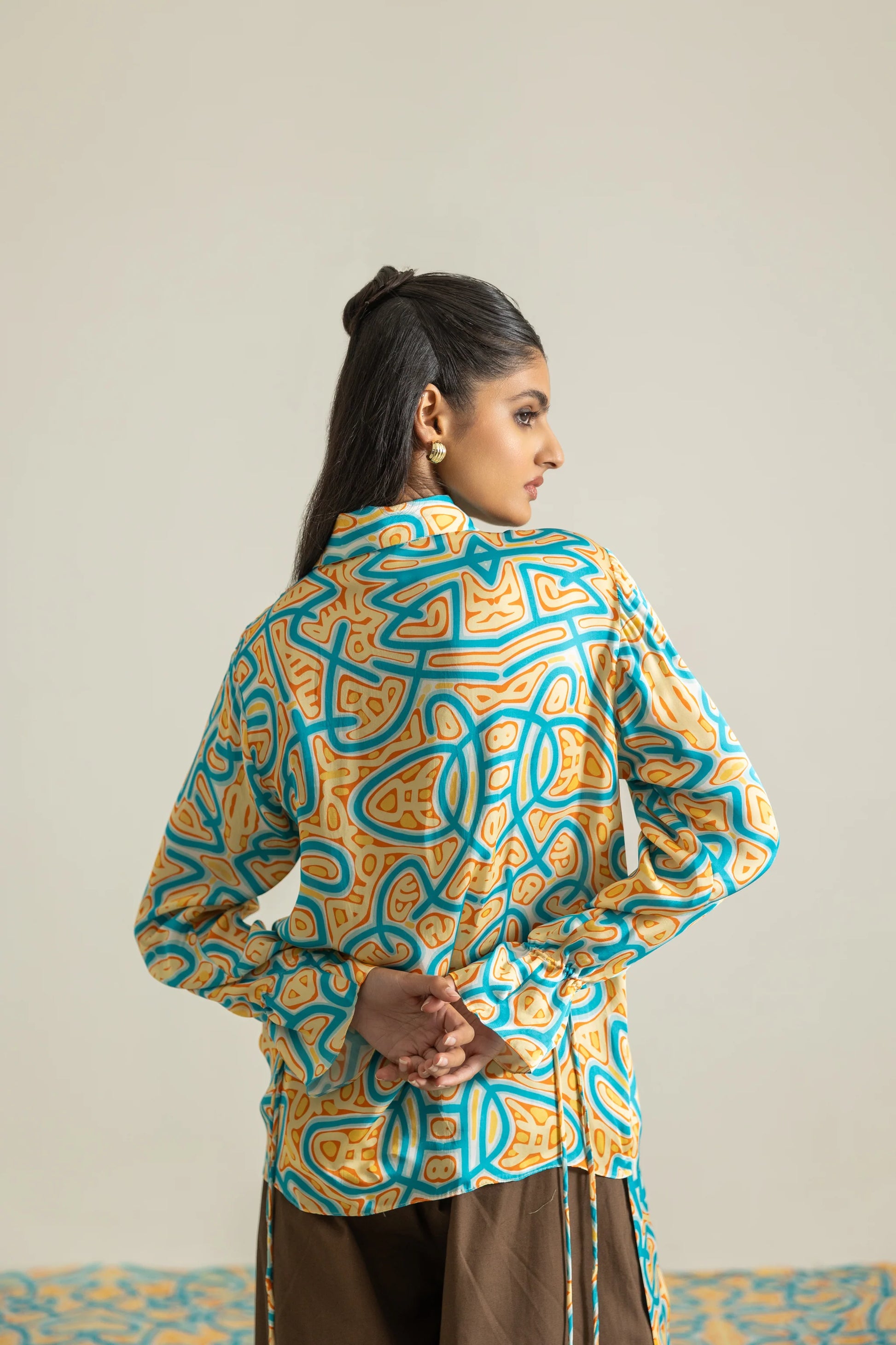 This show-stopping piece features a vibrant, all-over print crafted by artist, Bhuwal Prasad. The asymmetrical design, with one side dramatically longer than the other, adds a touch of glamour and whimsy. Adjustable drawstrings allow for a customizable fit, while the chic drawstring detailing on the sleeves adds a polished finish. Perfect for making a statement, this versatile shirt can be paired with everything from distressed denim to flowy skirts.