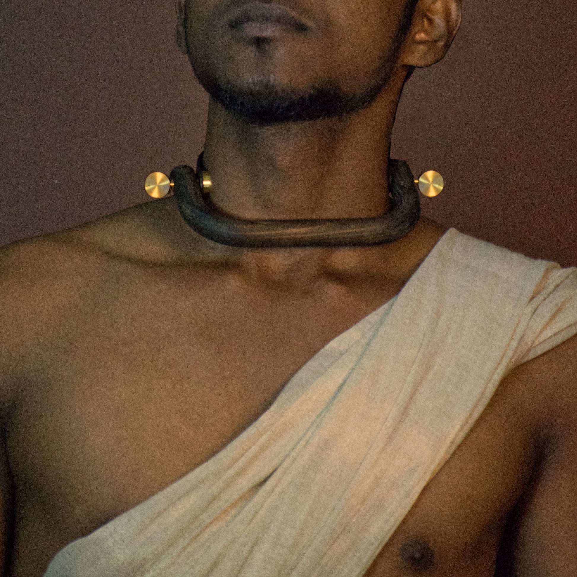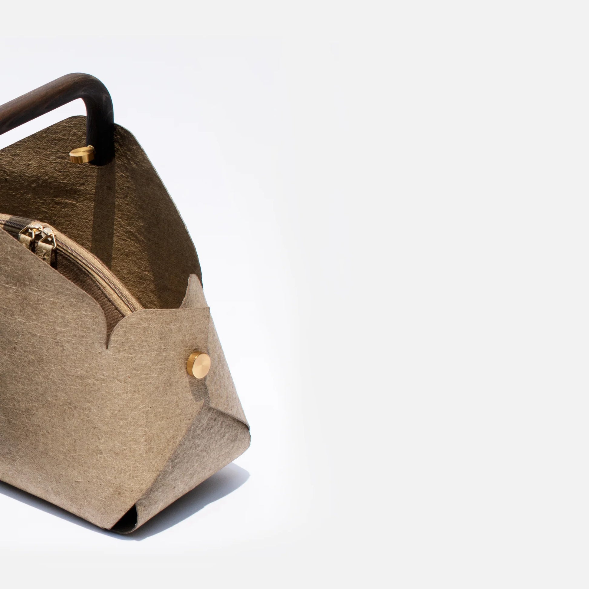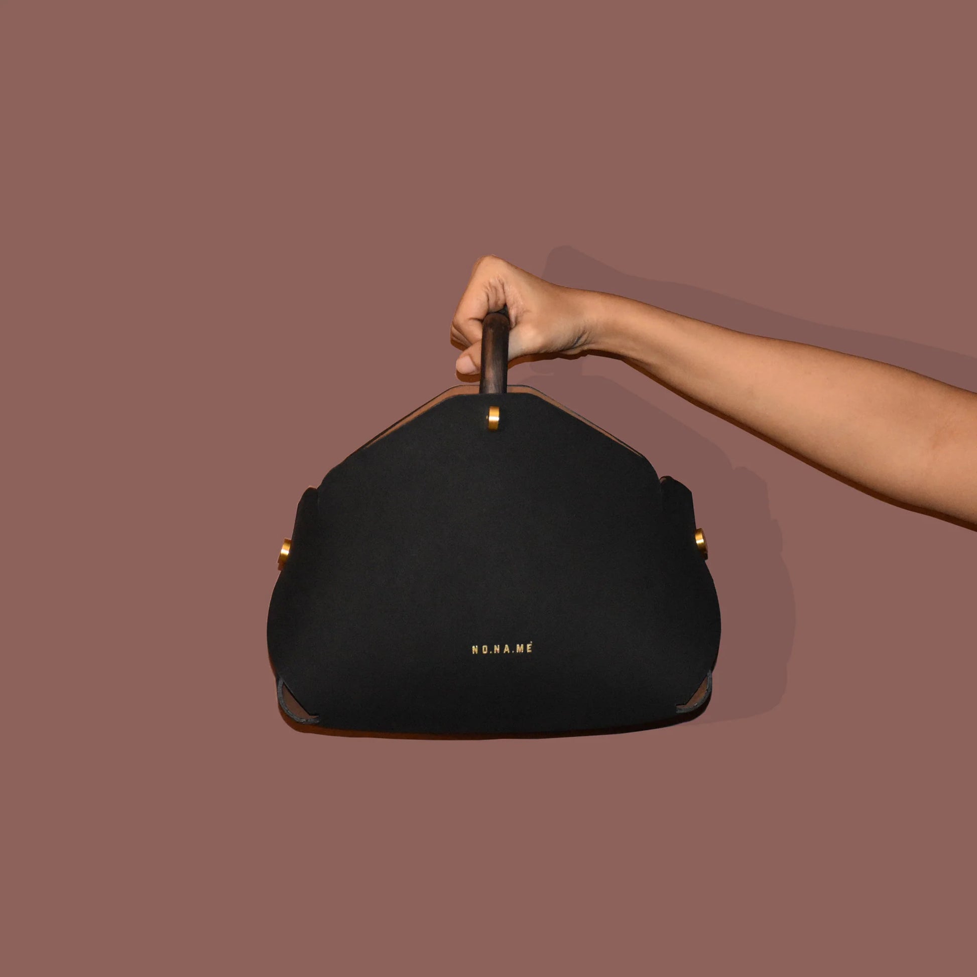 This bag comes with a fine malai leather component, precisely cut into an inspired form of a Dragonfly. Fold the flat leather sheet along the indicated edges to form the basic structure of the bag's body. Use the golden brass buttons to secure the flaps on both sides of the cuboidal structure of the body. Once the bag structure is enclosed, use the wooden component of the Dragonfly choker as the handle, placing it vertically on the bag, from the front flap to the back. Fasten it with the golden brass buttons.