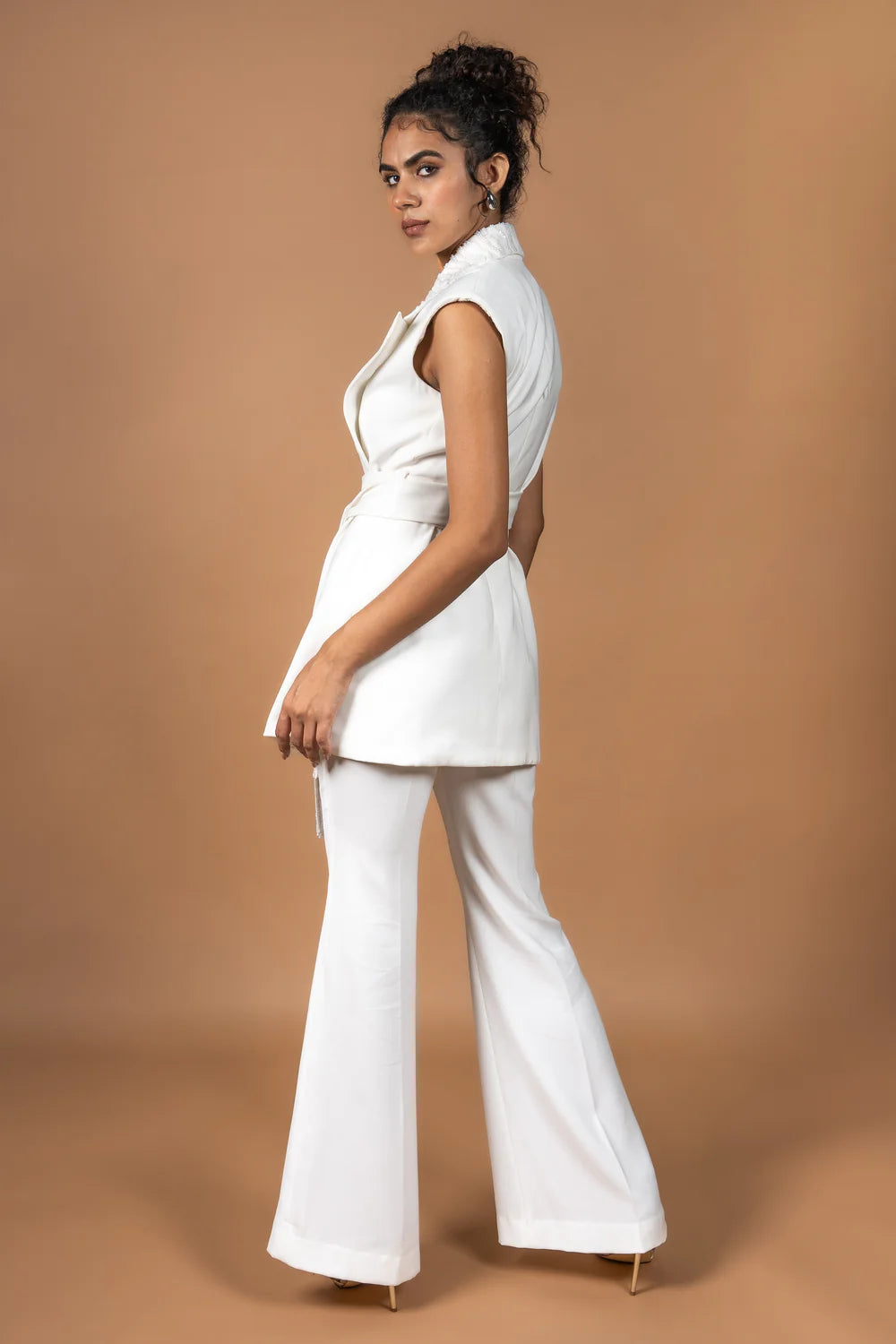 Blazer-style top featuring extended lapels and a sculpted collar layered with wave embroidery. Finished with a detachable sash and bell-bottom trousers.
