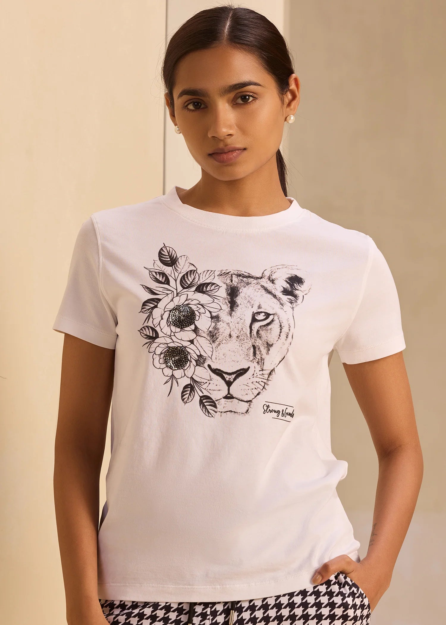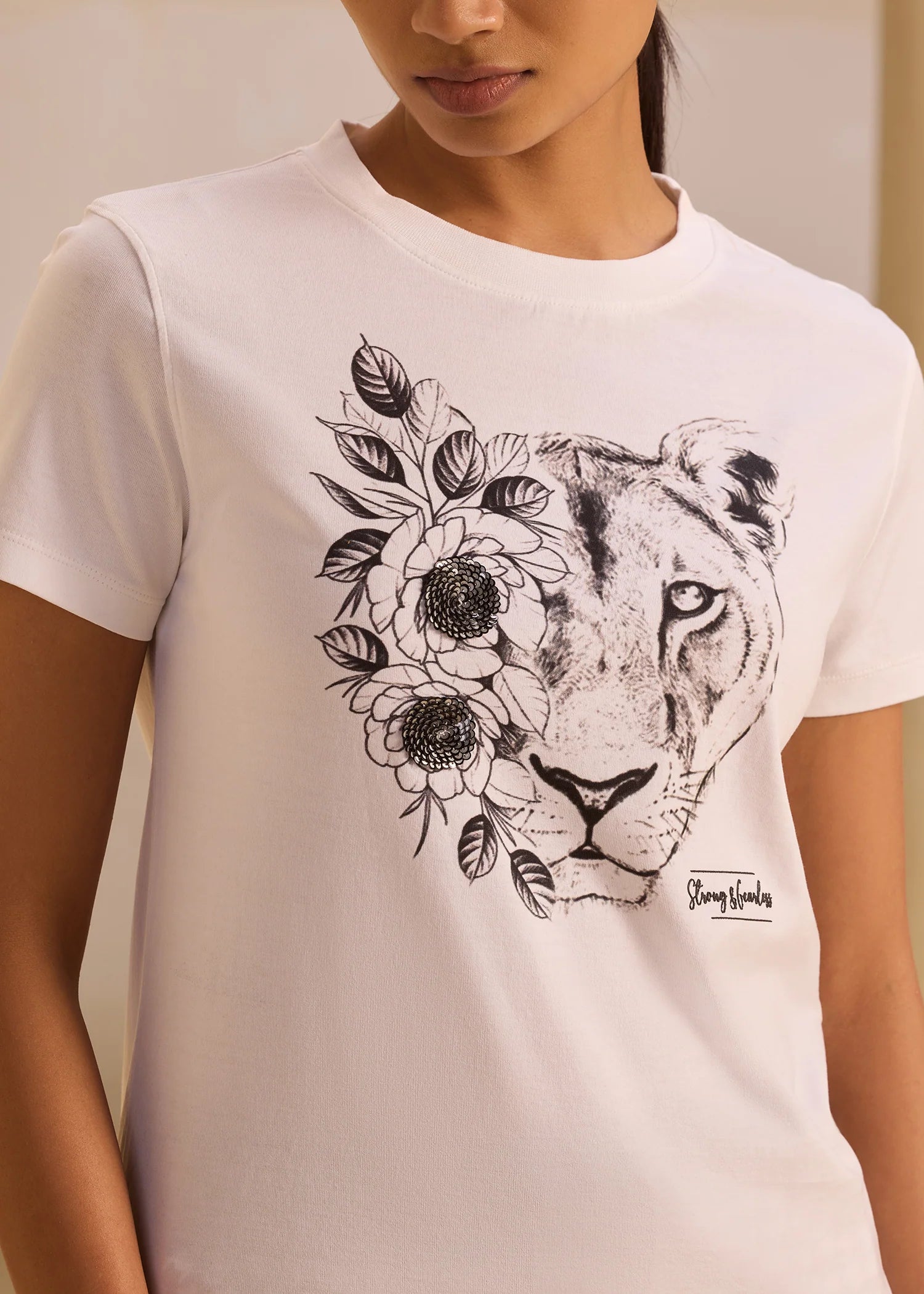 Elevate your style with this stunning tee, showcasing vibrant electric artwork and intricate embroidery alongside a majestic lioness print. Delicate sequins add a touch of glamour, while the buttery-soft 100% cotton fabric ensures unparalleled comfort against your skin. This striking design combines bold fashion with relaxed wearability, perfect for making a statement on casual days or dressing up for a night out.