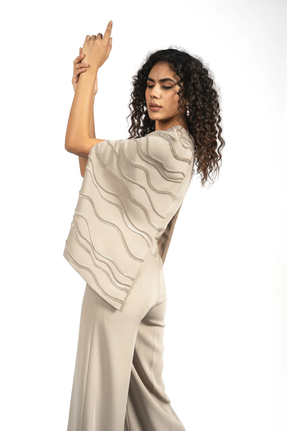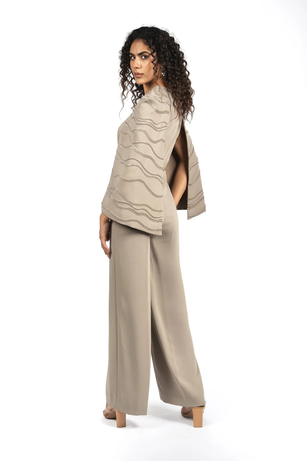 Square-neck jumpsuit with flared legs, paired with cape-style sleeves embellished with sequins and pearl embroidery.
