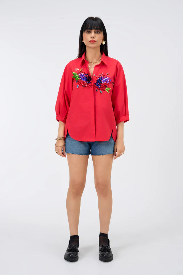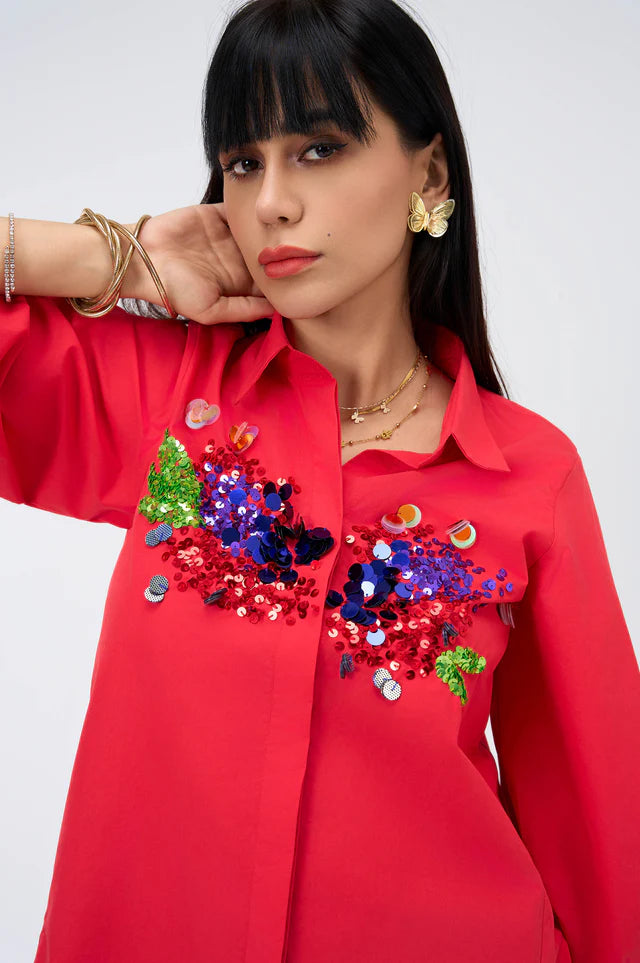 Make sparks fly with Firecracker, a vibrant red cotton shirt bursting with bold sequin work in electric greens, blues, and purples. With balloon sleeves and a relaxed fit, it's the ultimate statement piece for festive nights, birthday dinners, or rooftop cocktails.