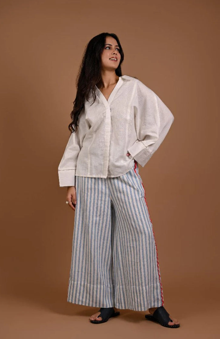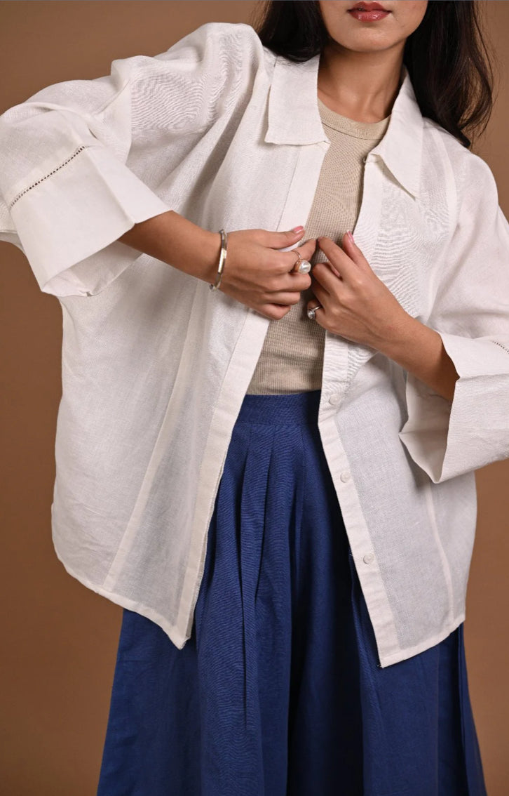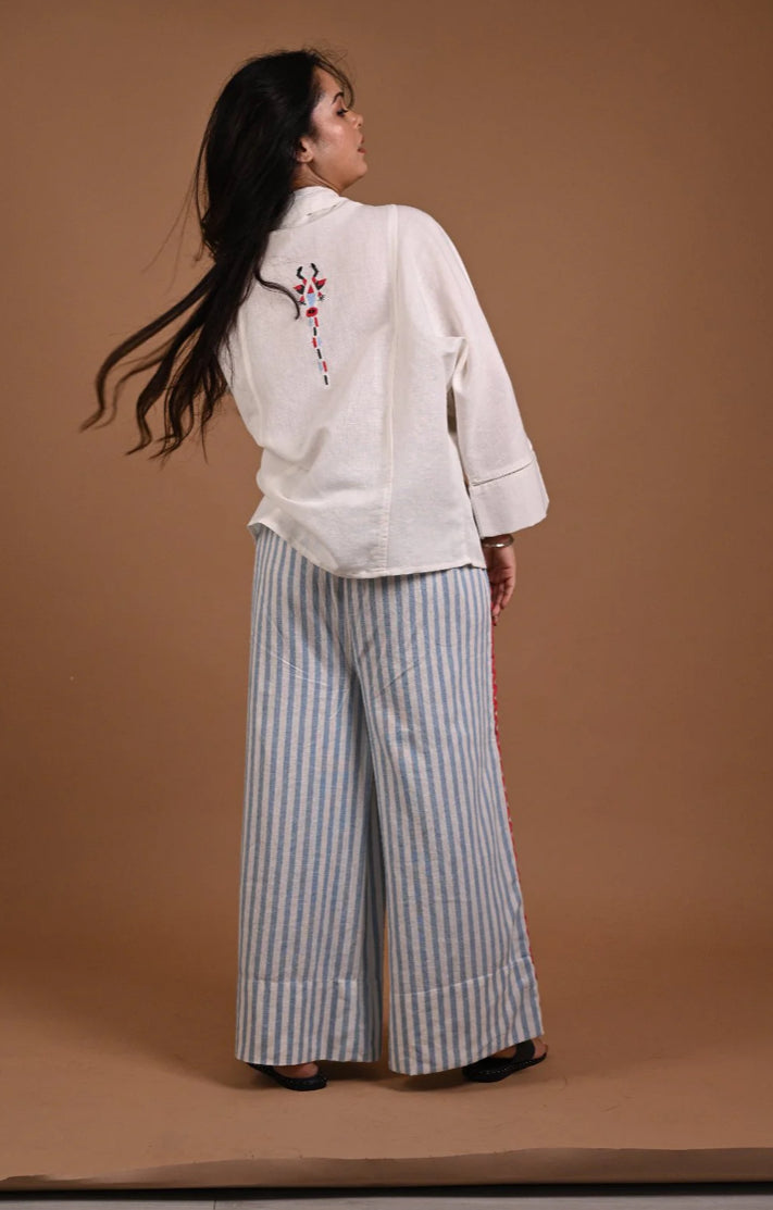 A crisp white linen shirt that exudes minimalistic charm, with our signature giraffe embroidered in striking red and blue on the back. Perfectly tailored for a relaxed, refined look, this piece adds a playful, artistic twist to classic white