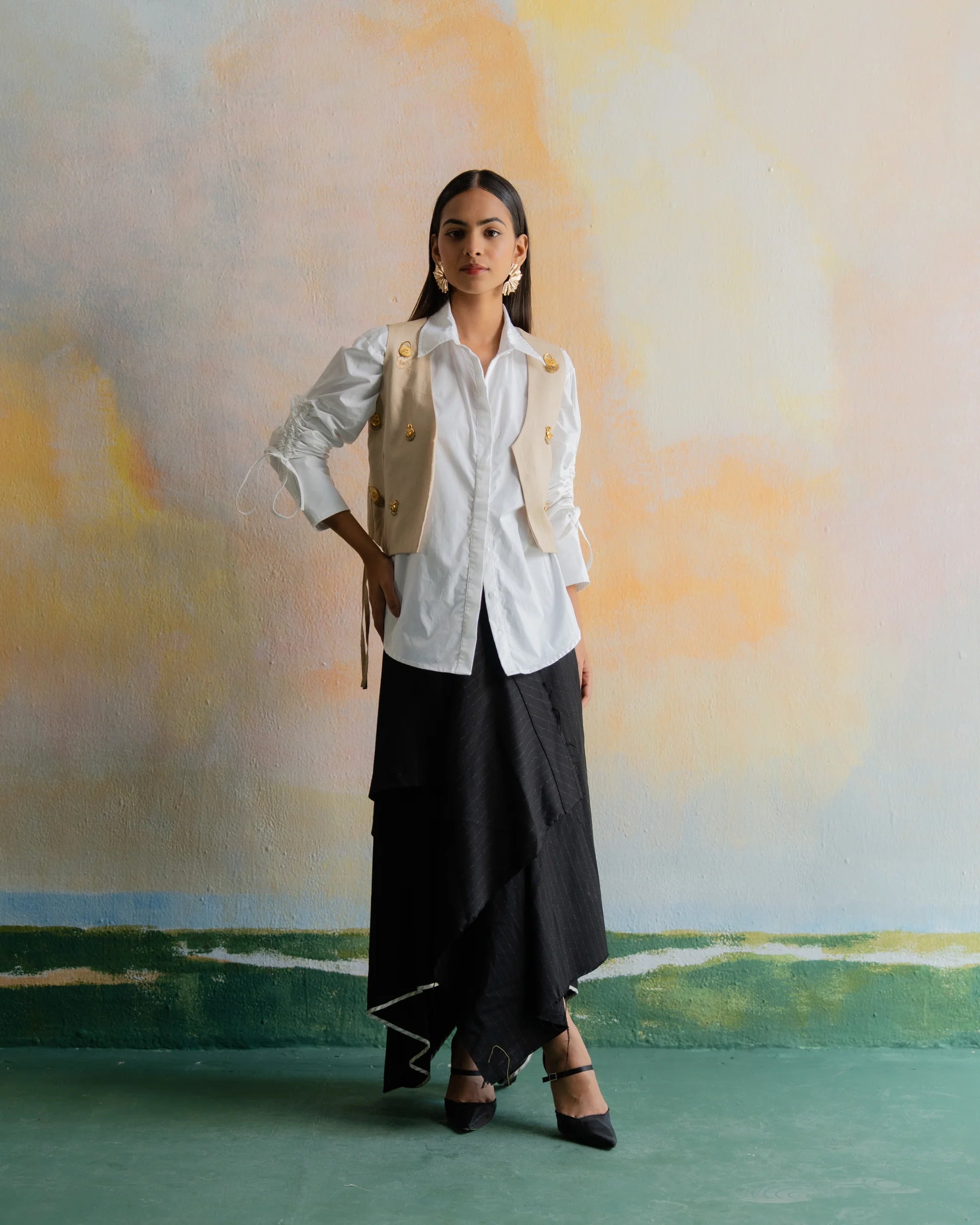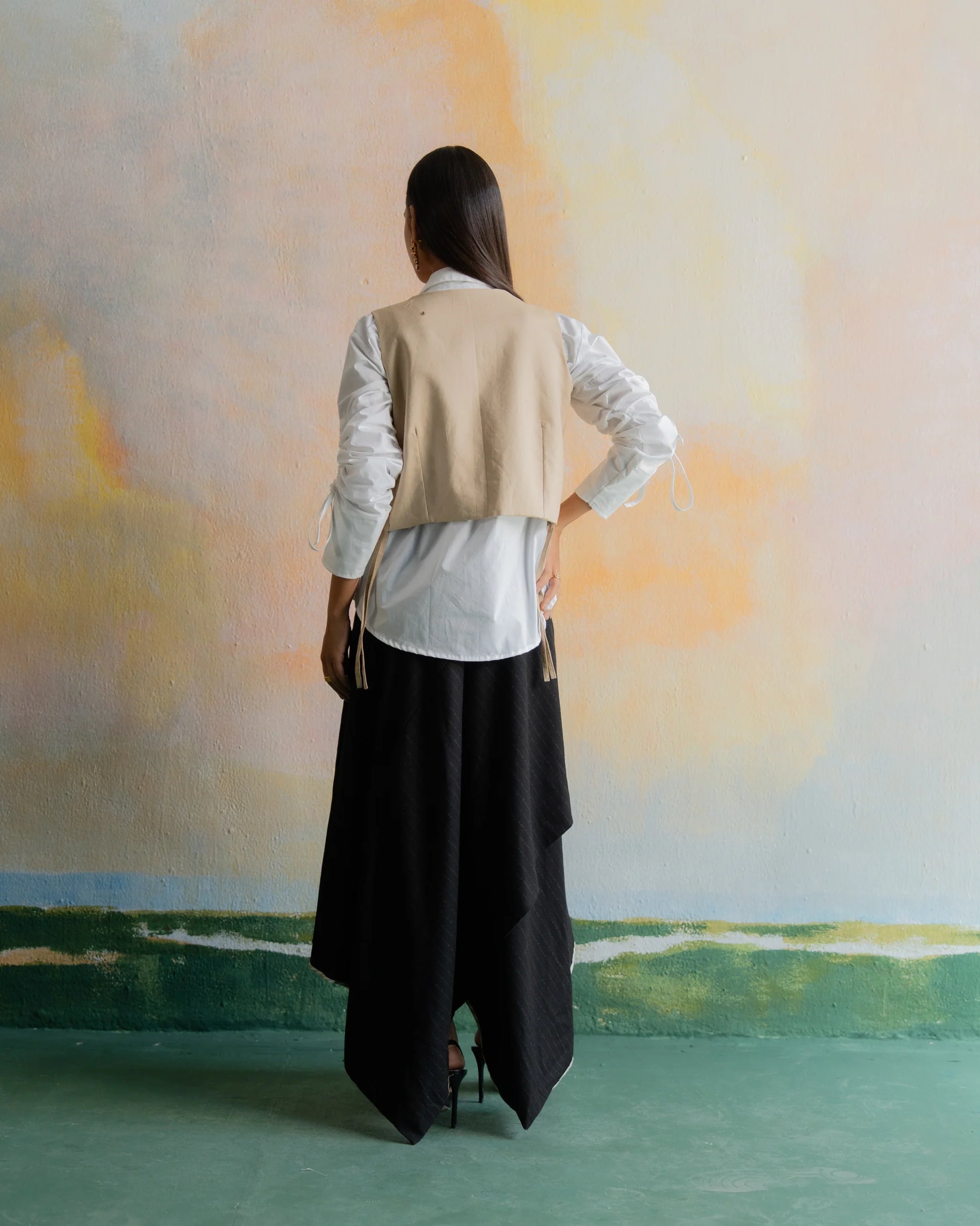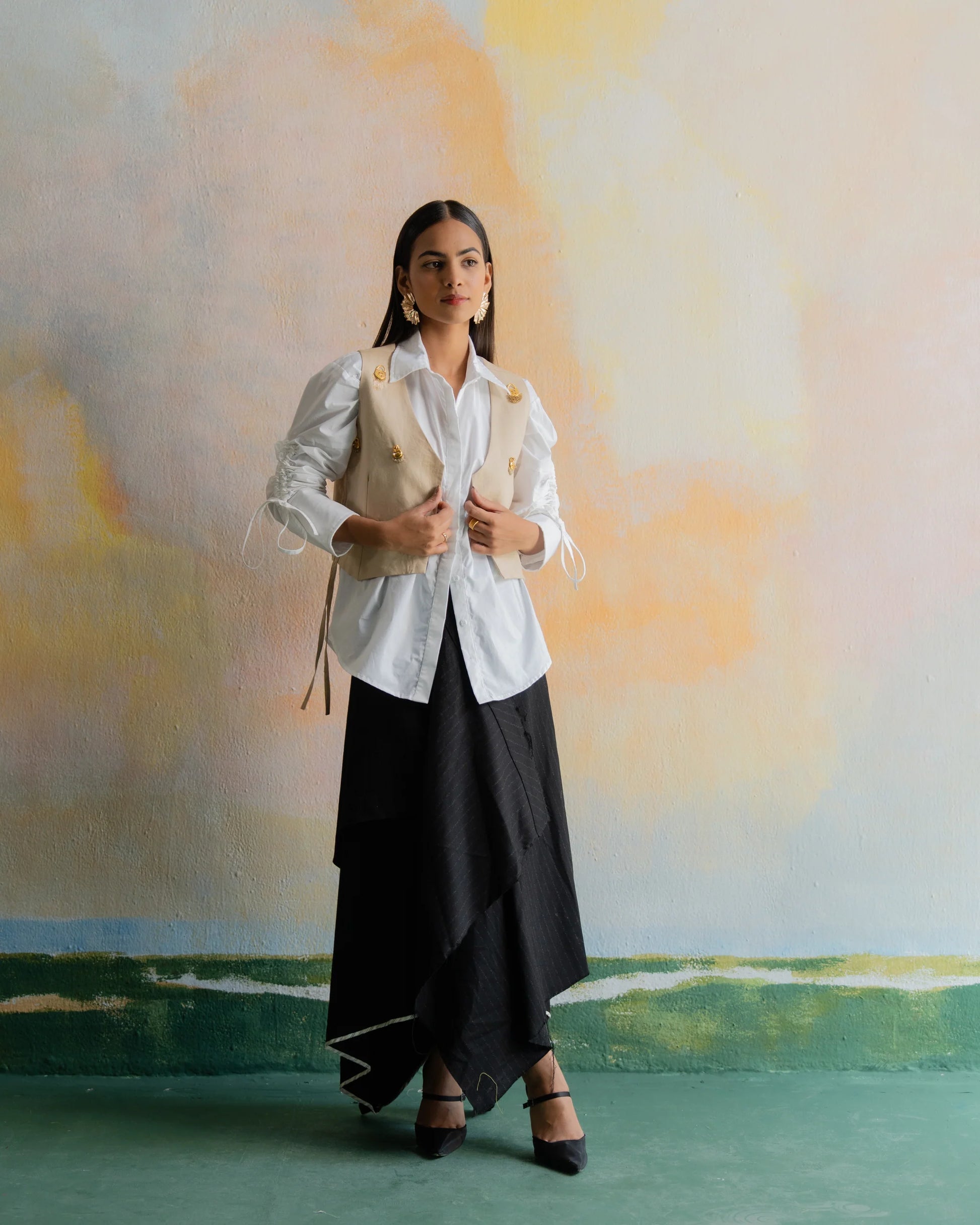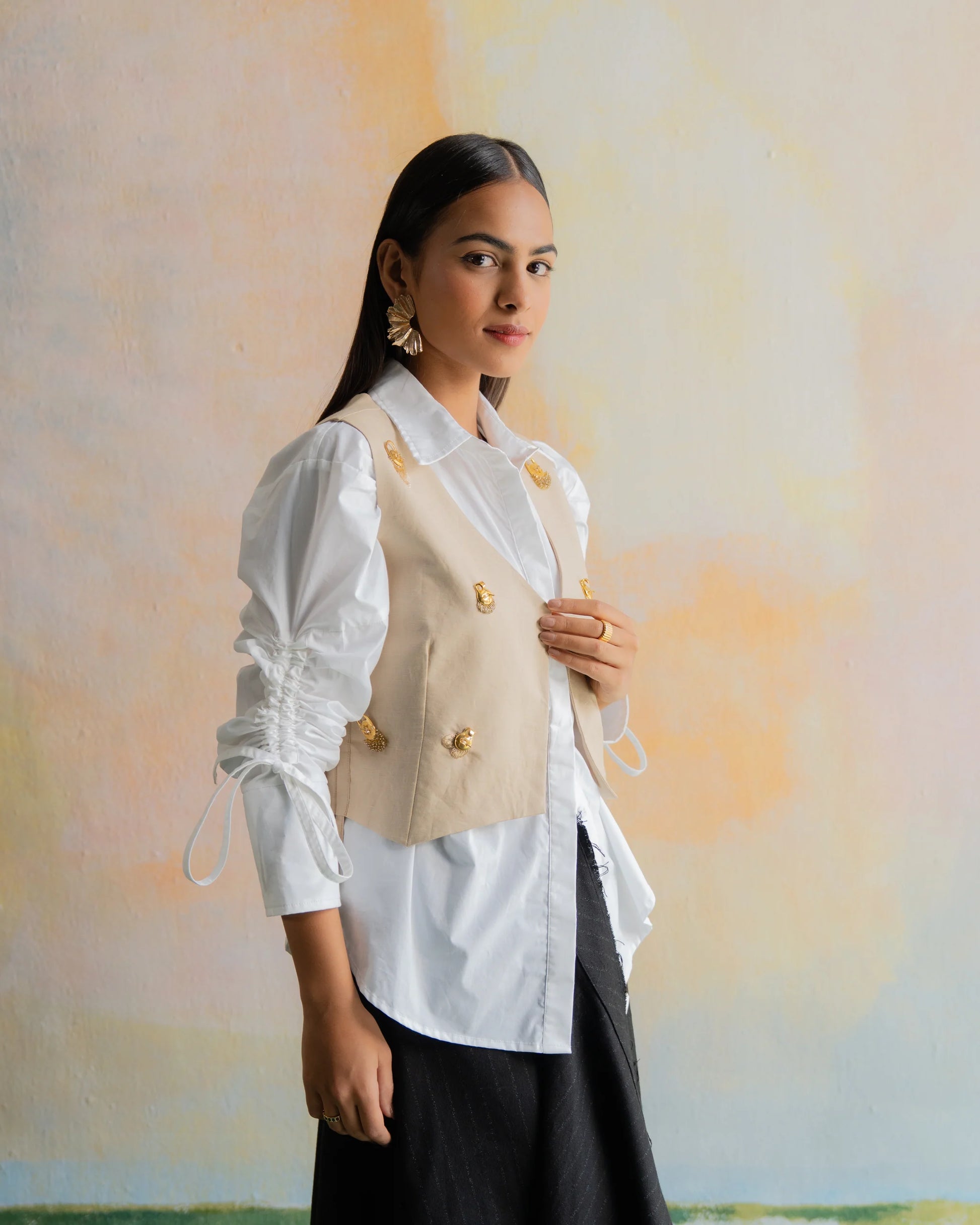 Exuding quiet regality, this sleeveless structured beige top is delicately embroidered with hints of gold. Whether layered over crisp whites or worn solo, it brings a touch of golden hour elegance to any ensemble.