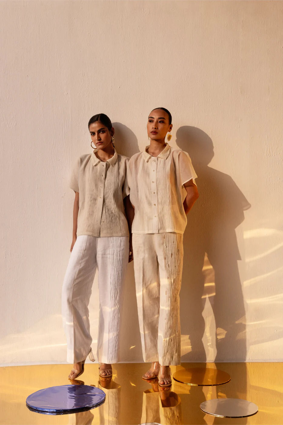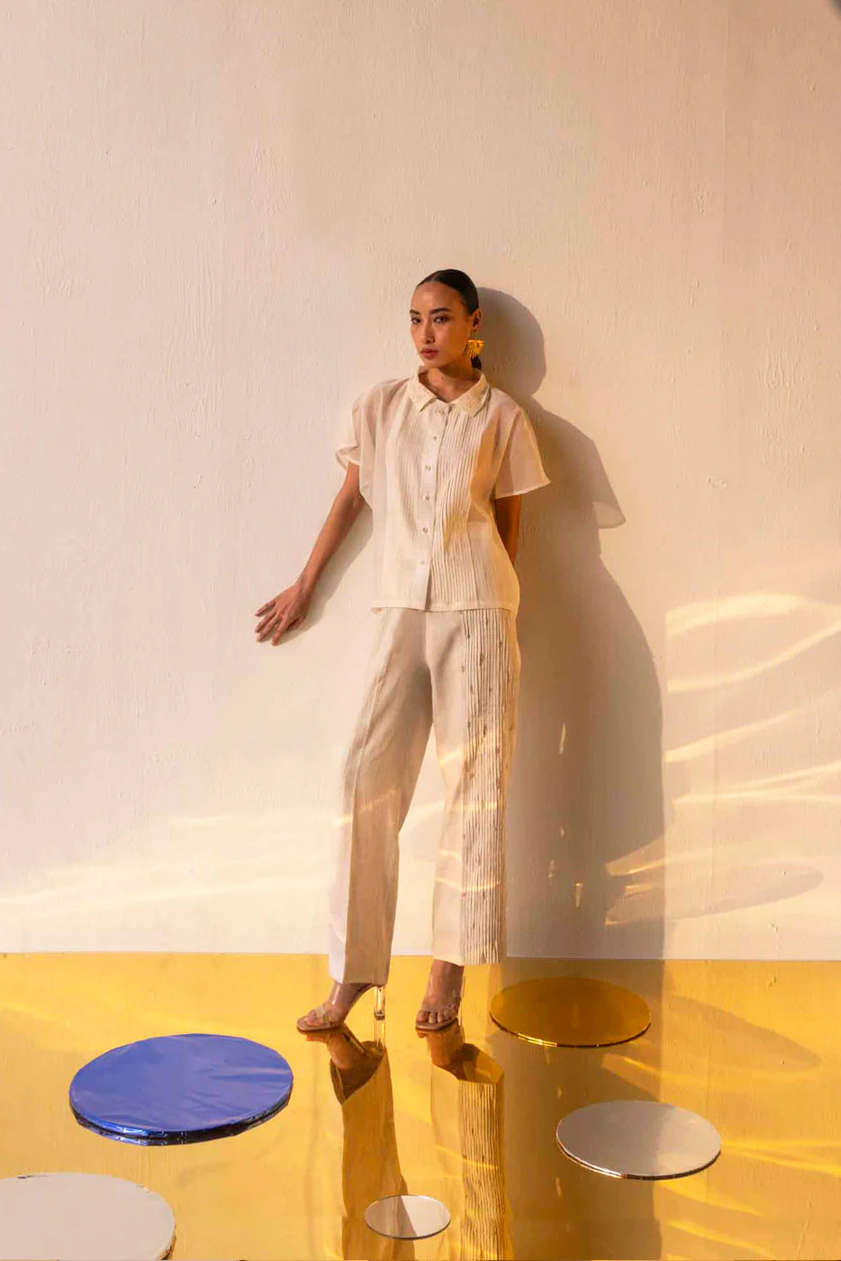 Pants has pleats on both sides, with glass crystals delicately embellished on one side for a touch of sparkle. With an elasticated waist at the back for a comfortable fit, they offer a straight fit from the bottom and include two side pockets for added convenience.