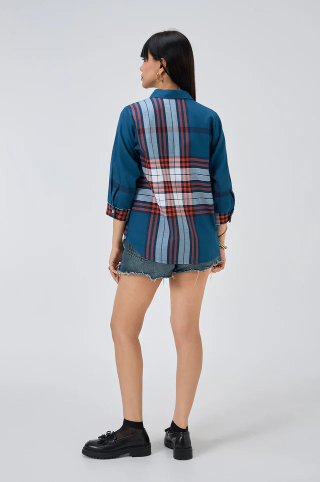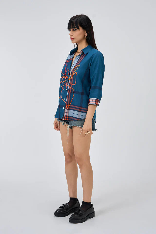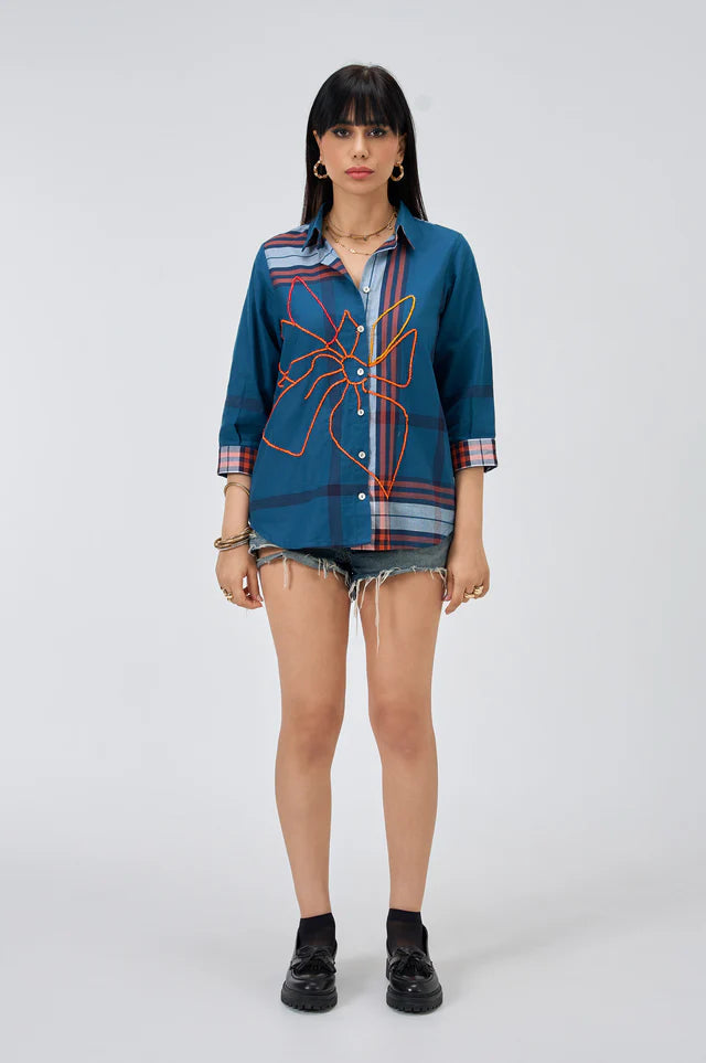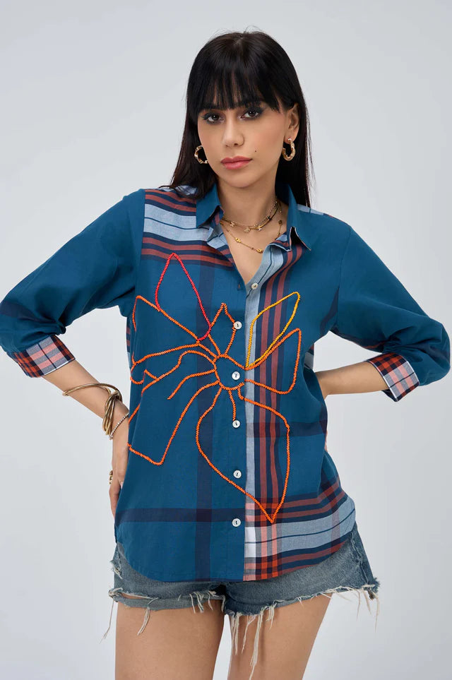 Gridlock is a Bondi blue plaid cotton shirt that finds rhythm in contrast. The bold floral embroidery in vibrant orange dances across the front, adding a touch of artistic rebellion. With checked cuffs and a relaxed silhouette, this piece is equal parts structure and spontaneity.