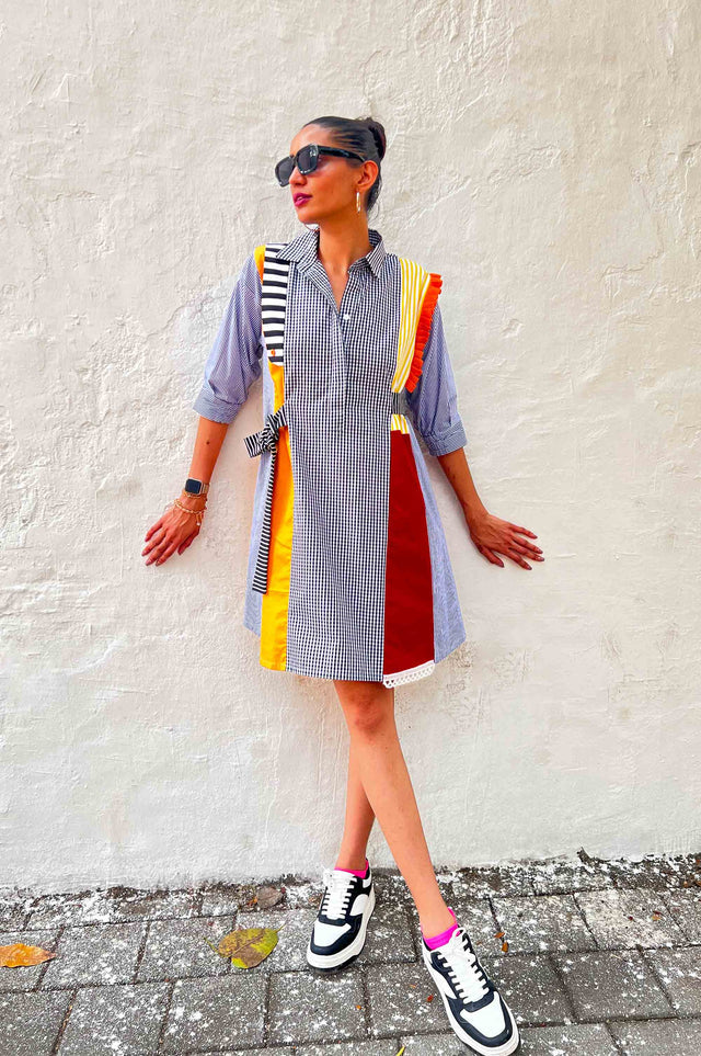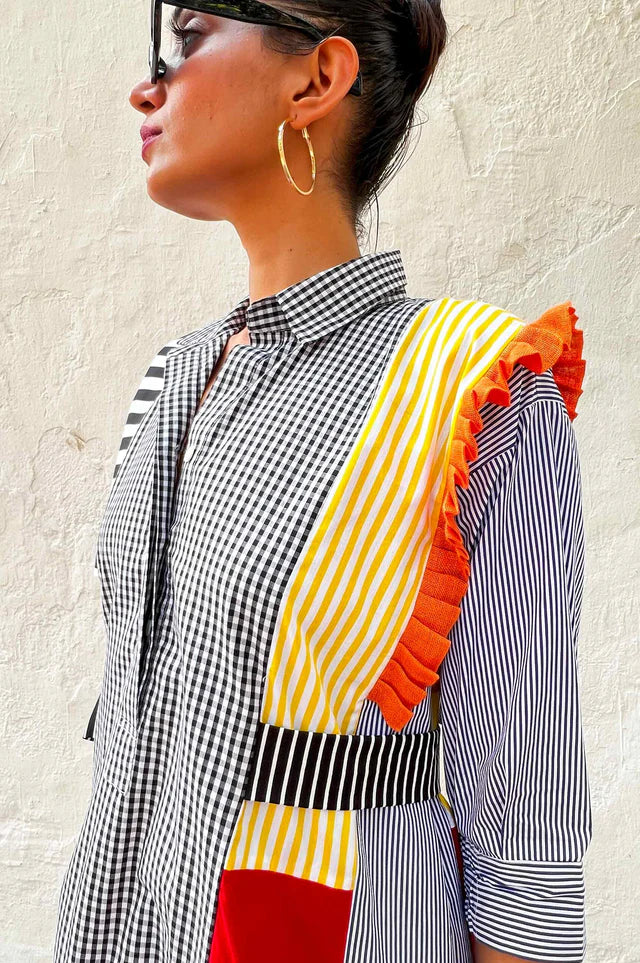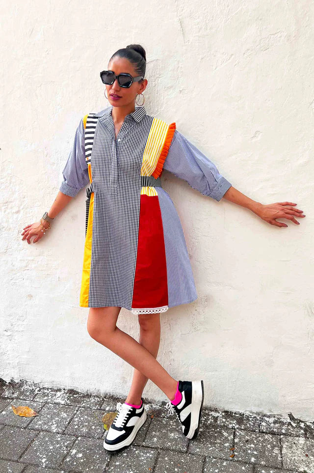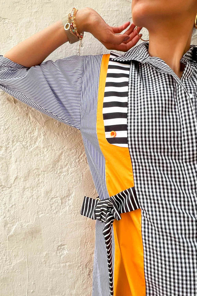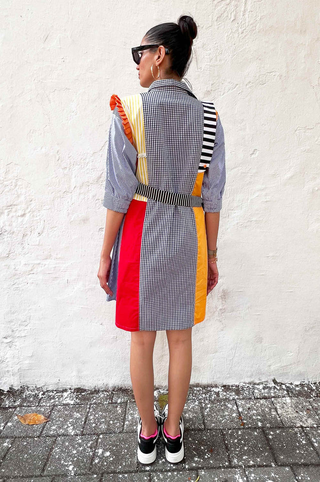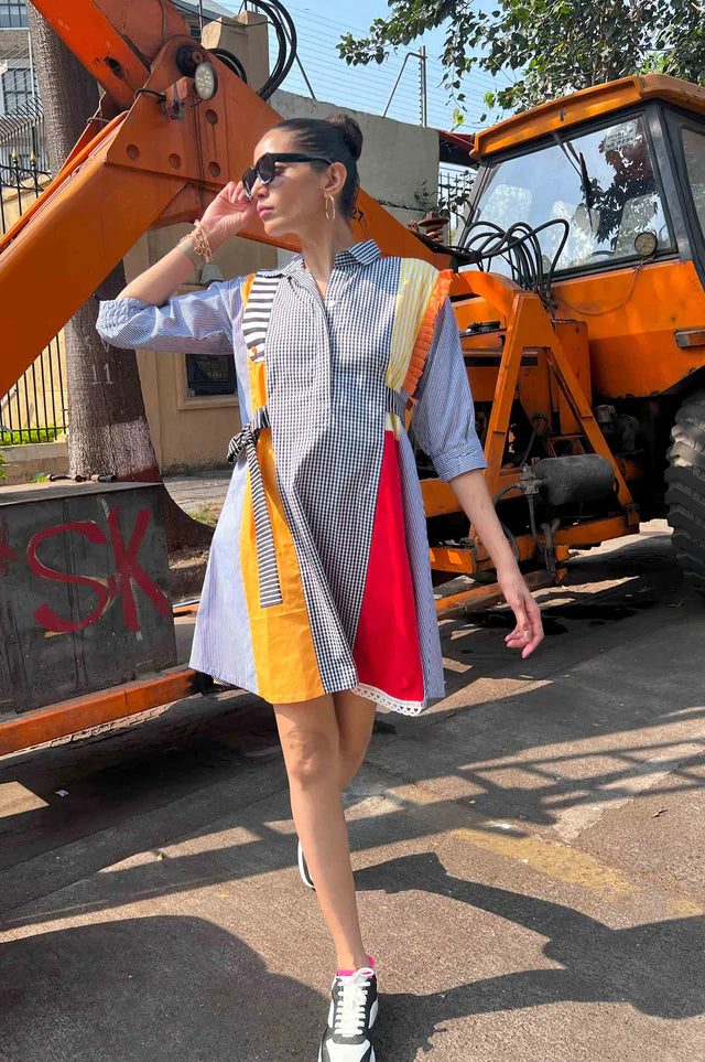Headlight – a paneled cotton loose dress that effortlessly blends bold hues and patterns. The captivating combination of red and mango, accentuated by playful stripes and checks, makes this dress a true fashion standout. The included belt adds a touch of chic to your look. Don't miss out on the chance to radiate style and joy with Headlight. It's your time to shine, beautifully!