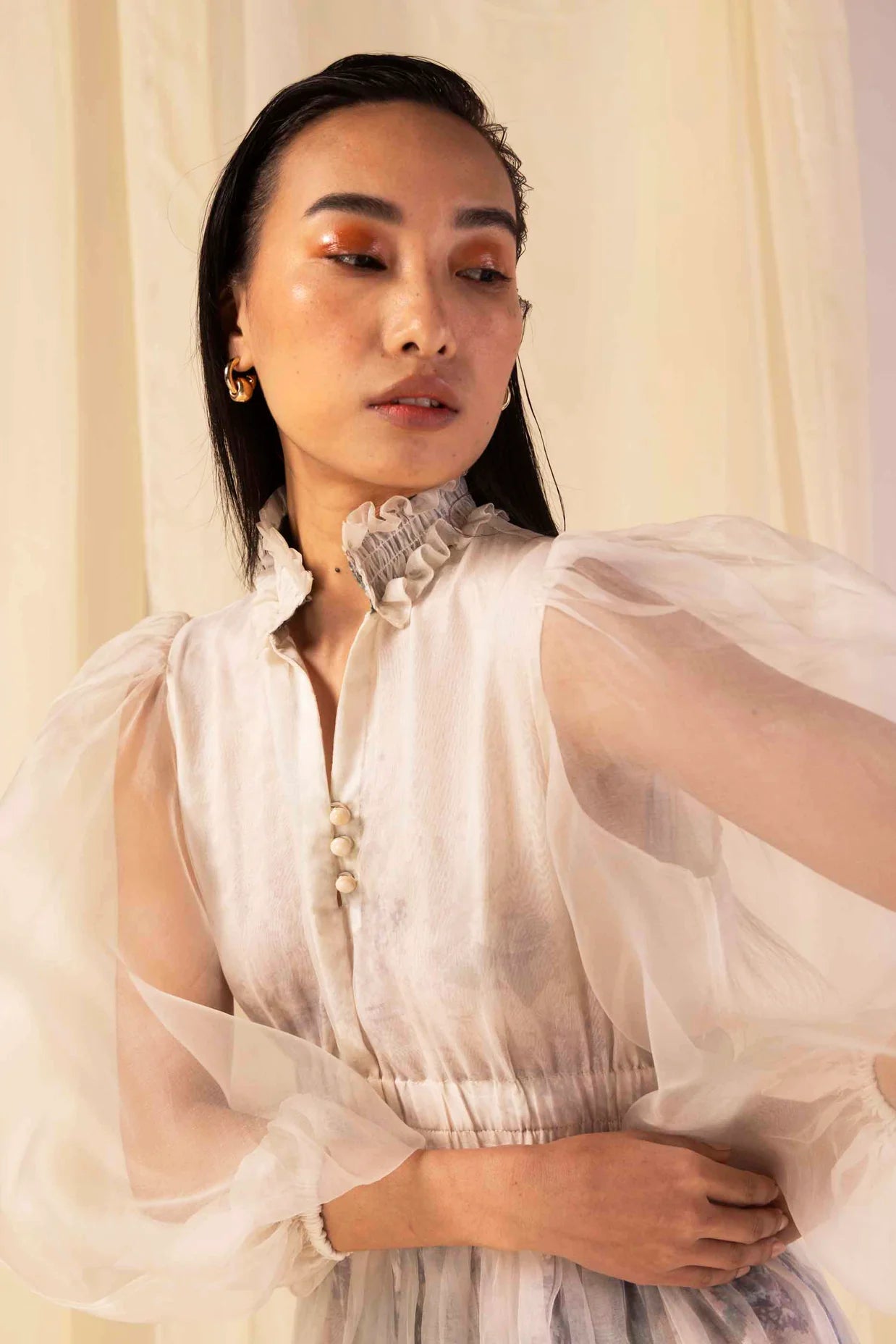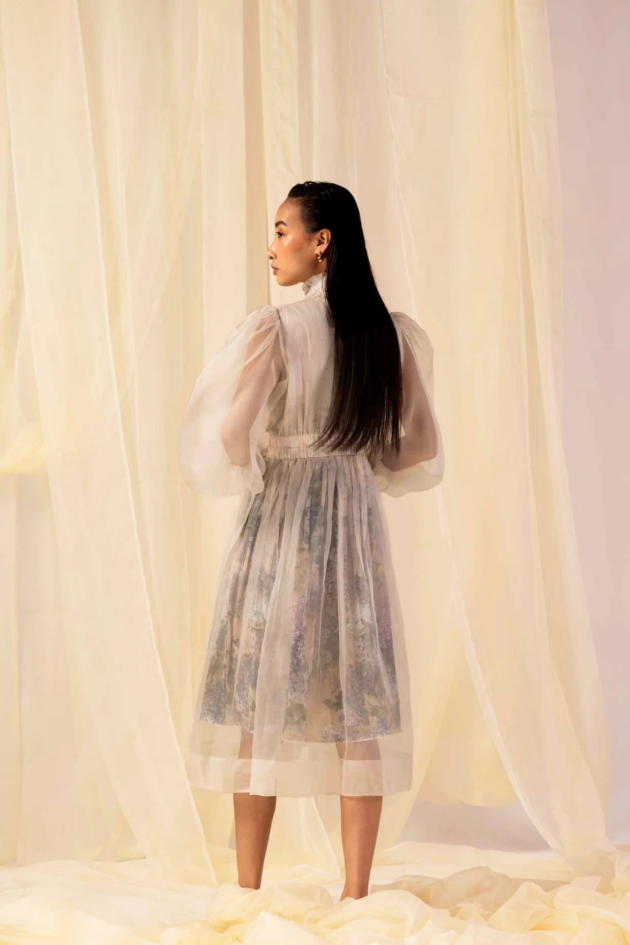 Hydra hues buttery moss mid-length dress crafted from two luxurious fabrics, a printed base lining peeks through a sheer organza overlay creating a dreamy layered effect. The delicate ruffled neckline and button-front opening offer a soft, feminine touch, while the elasticated waist with soft gathers creates a relaxed yet flattering fit. Balloon sleeves with elasticated cuffs and a subtle puff add graceful volume, and pleat detailing at the back enhances its effortless movement.