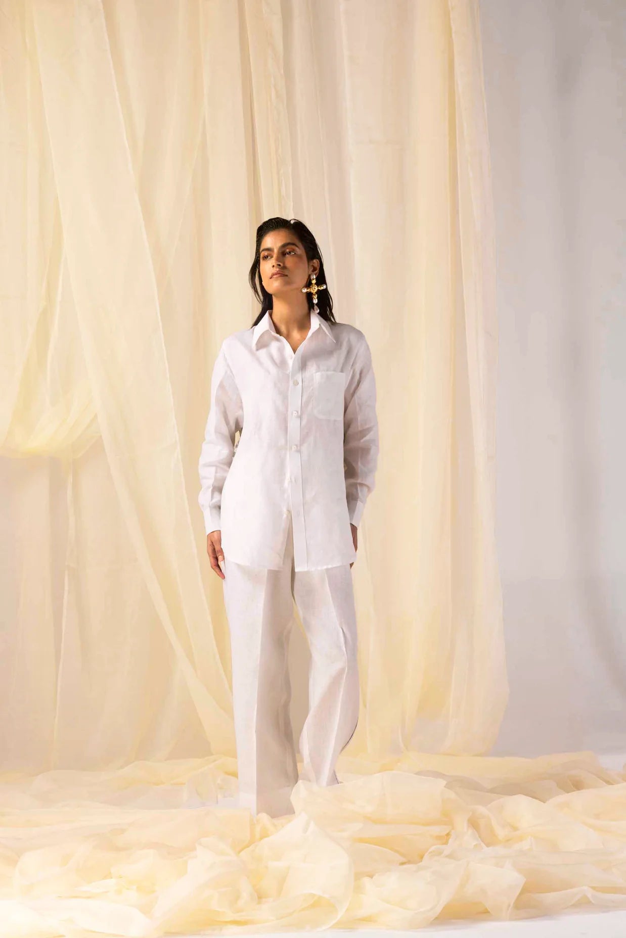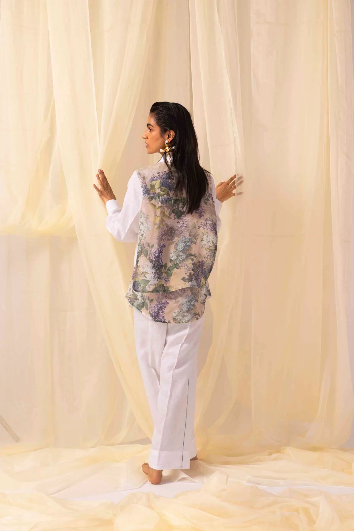 Co-ord set has a white linen shirt with a normal collar, front button opening, full sleeves with cuffs, and a hydrangea print on the back. The shirt also has a front pocket. The elasticated trousers offer a relaxed fit with side pockets and subtle side detailing, making it perfect for everyday wear.