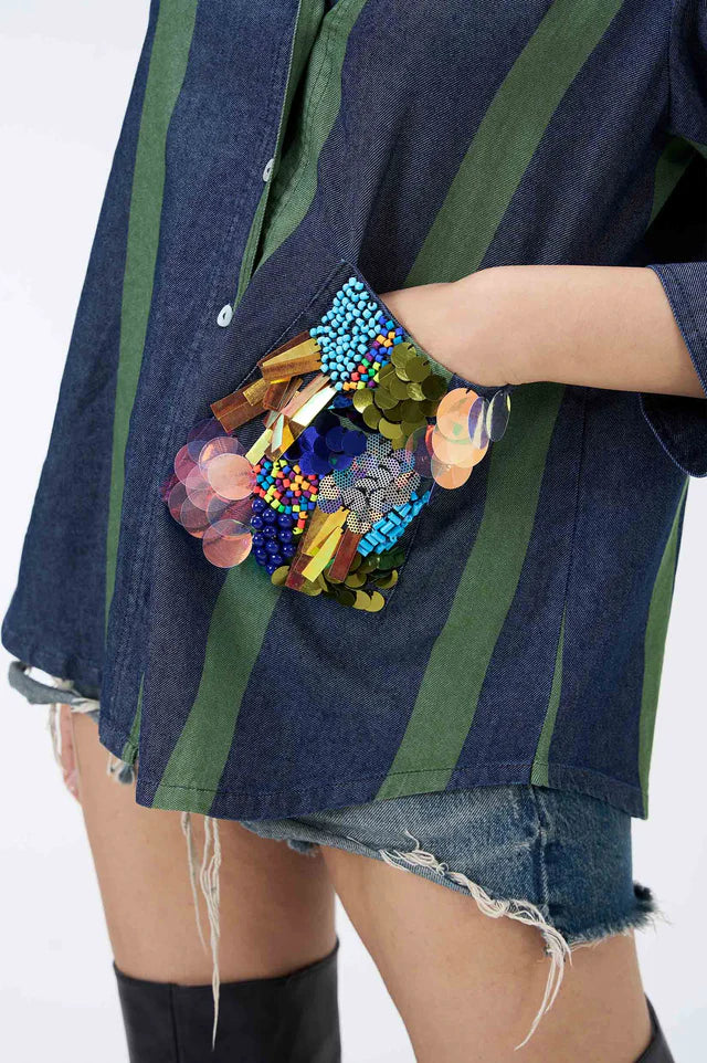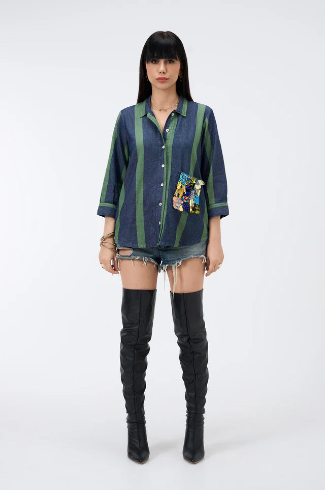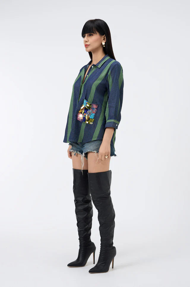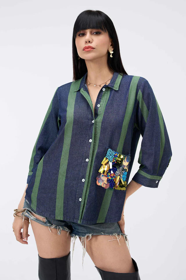 "Interstellar" takes off with bold green-and-indigo stripes, a soft cotton denim, finished with a pocket that’s nothing short of cosmic — adorned with playful sequins and beadwork. A party-ready shirt for club nights, travel dinners, or stargazing escapes.