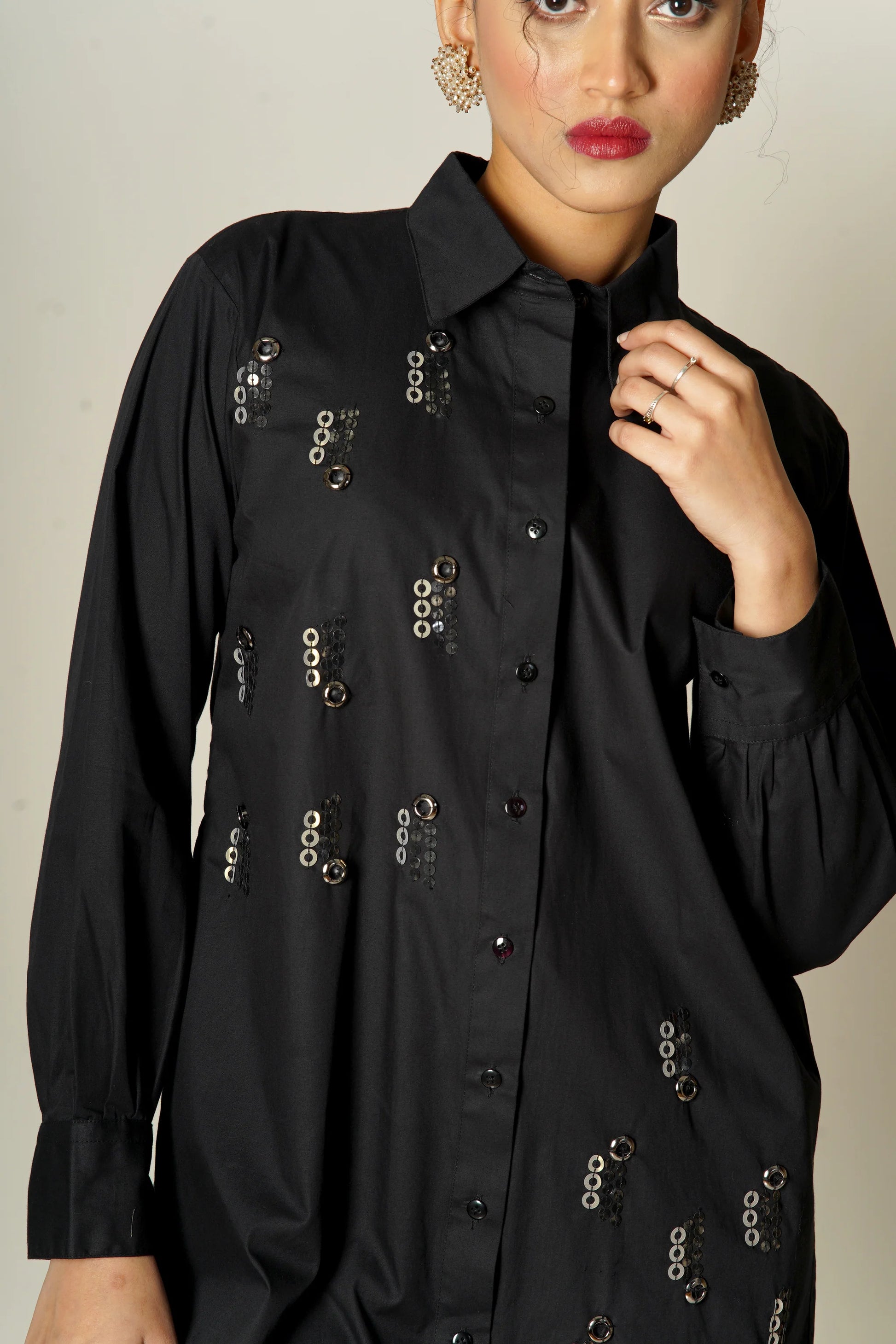Radiate understated glamour with the Izrah sequin Shirt Dress, a versatile piece that combines classic tailoring with modern embellishment. This button-down dress features scattered metallic eyelet accents giving it a contemporary twist. Pair it with statement heels or ankle boots for a bold, contemporary look.