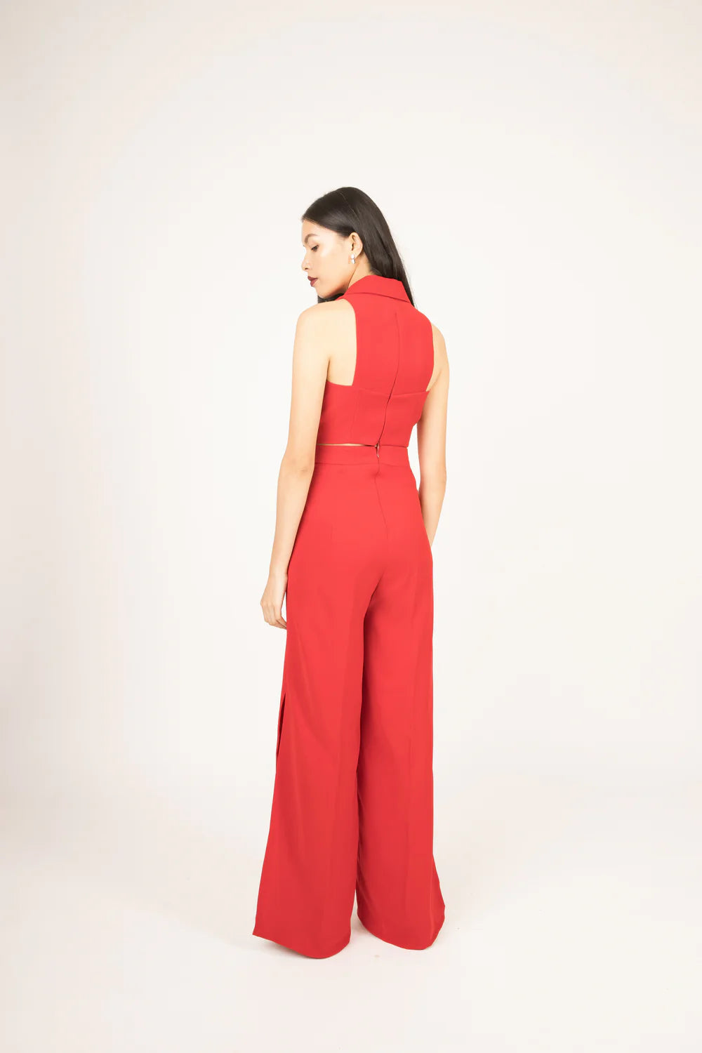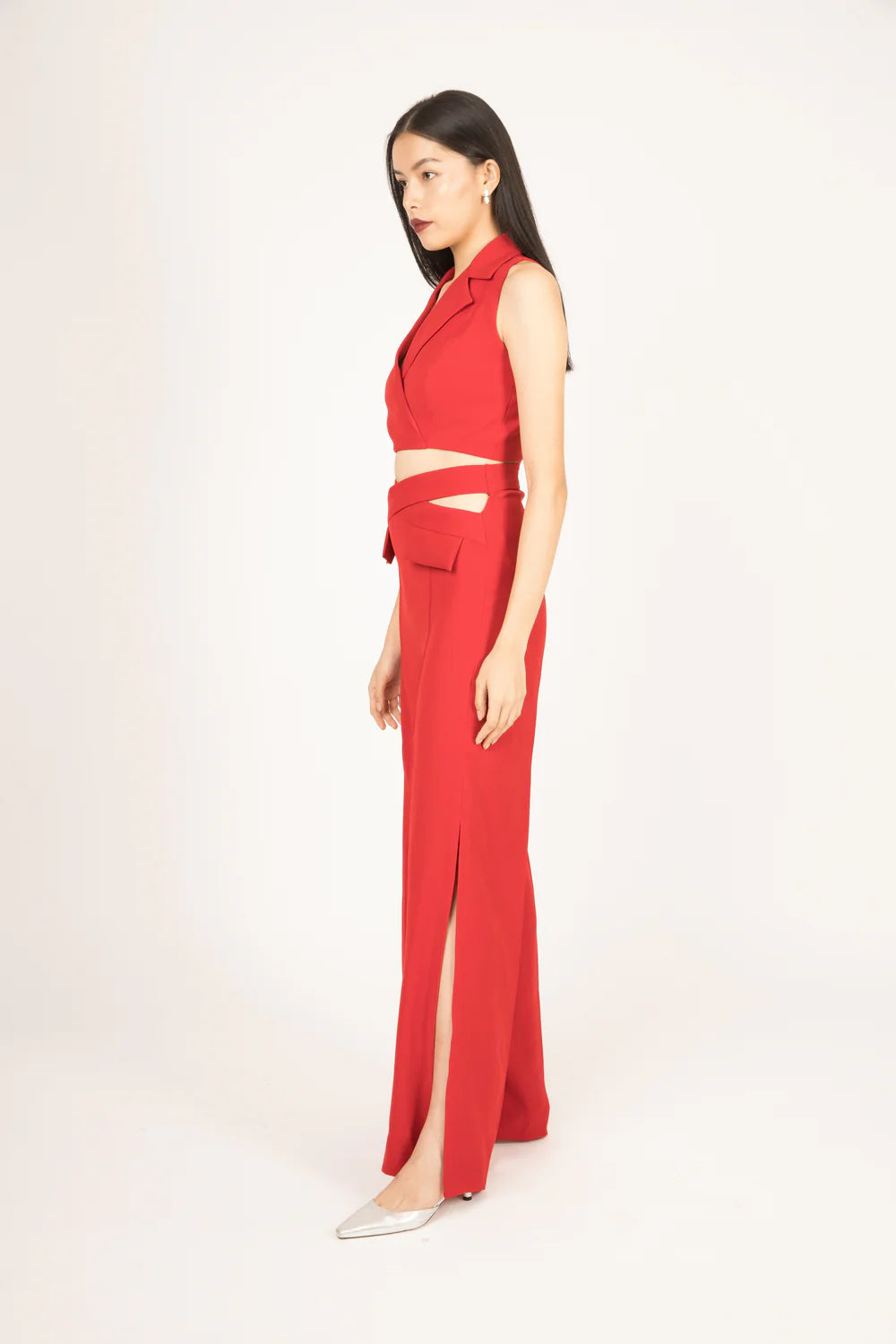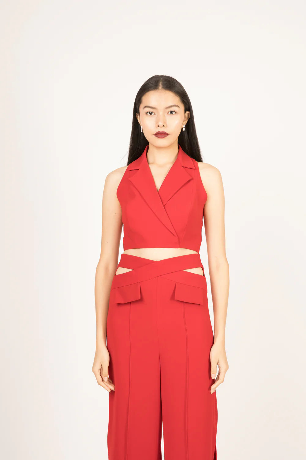 A crop top featuring a sharp lapel. The high-rise trousers are defined with a wrapped crossover waist detail and side slits.