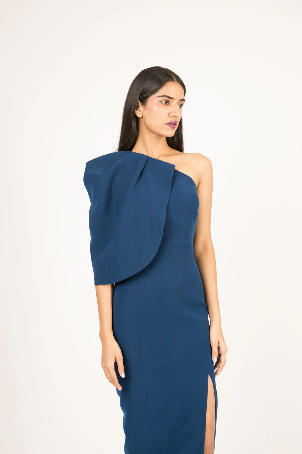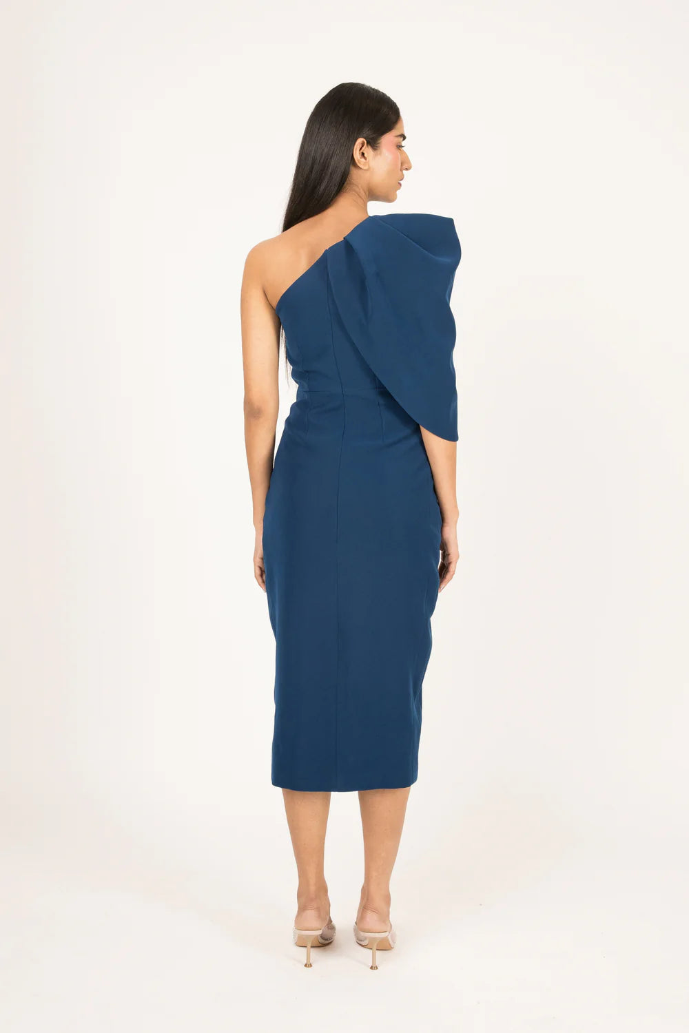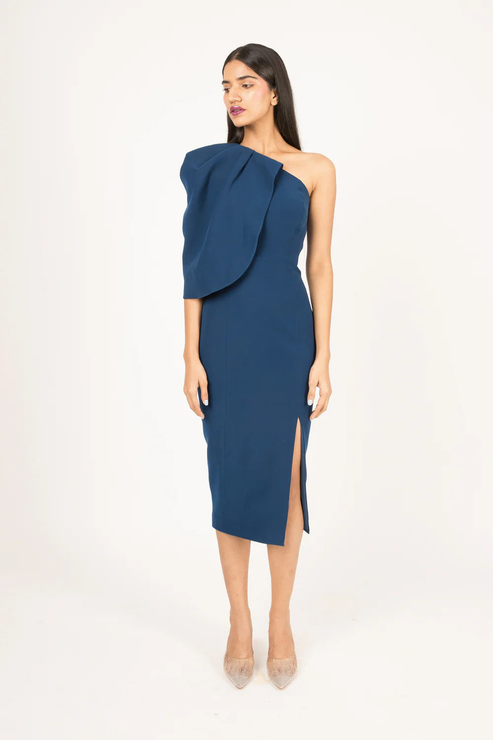 One-shoulder midi dress featuring a sculpted shoulder panel. Fitted silhouette with a clean bodice and front slit.