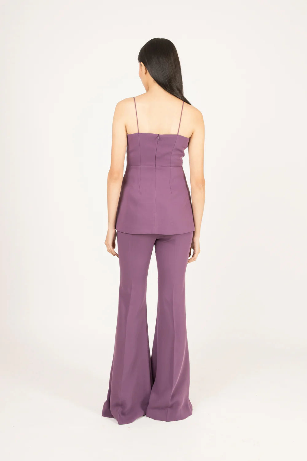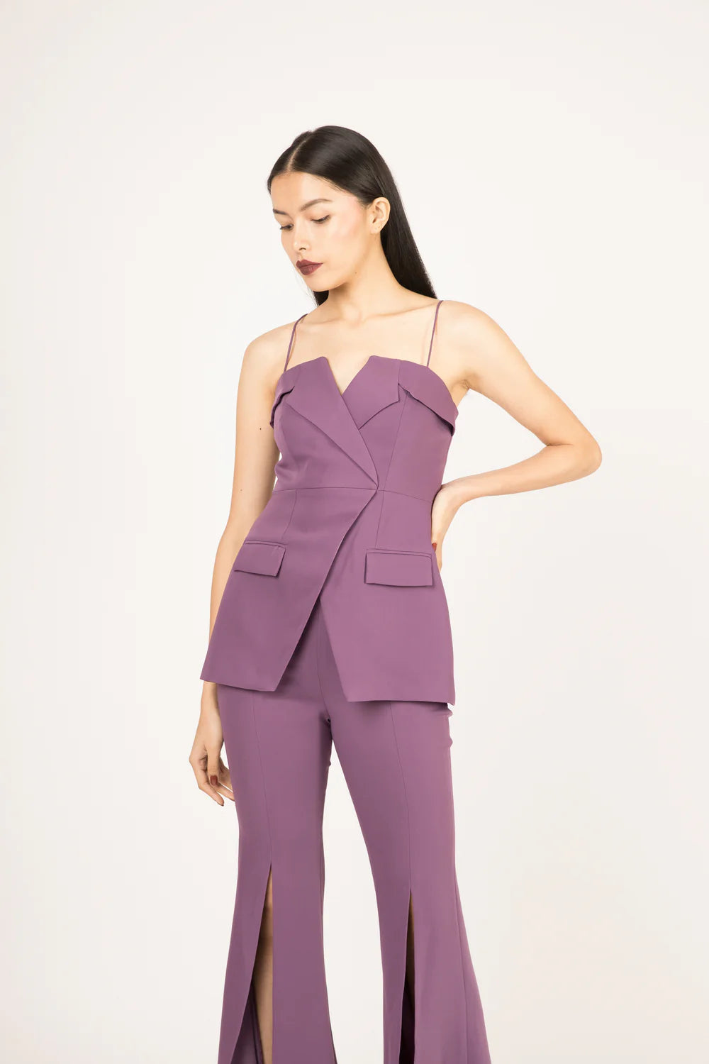 A blazer-inspired top with clean panel construction and fine shoulder straps, paired with front-slit trousers that flare gently at the hem.